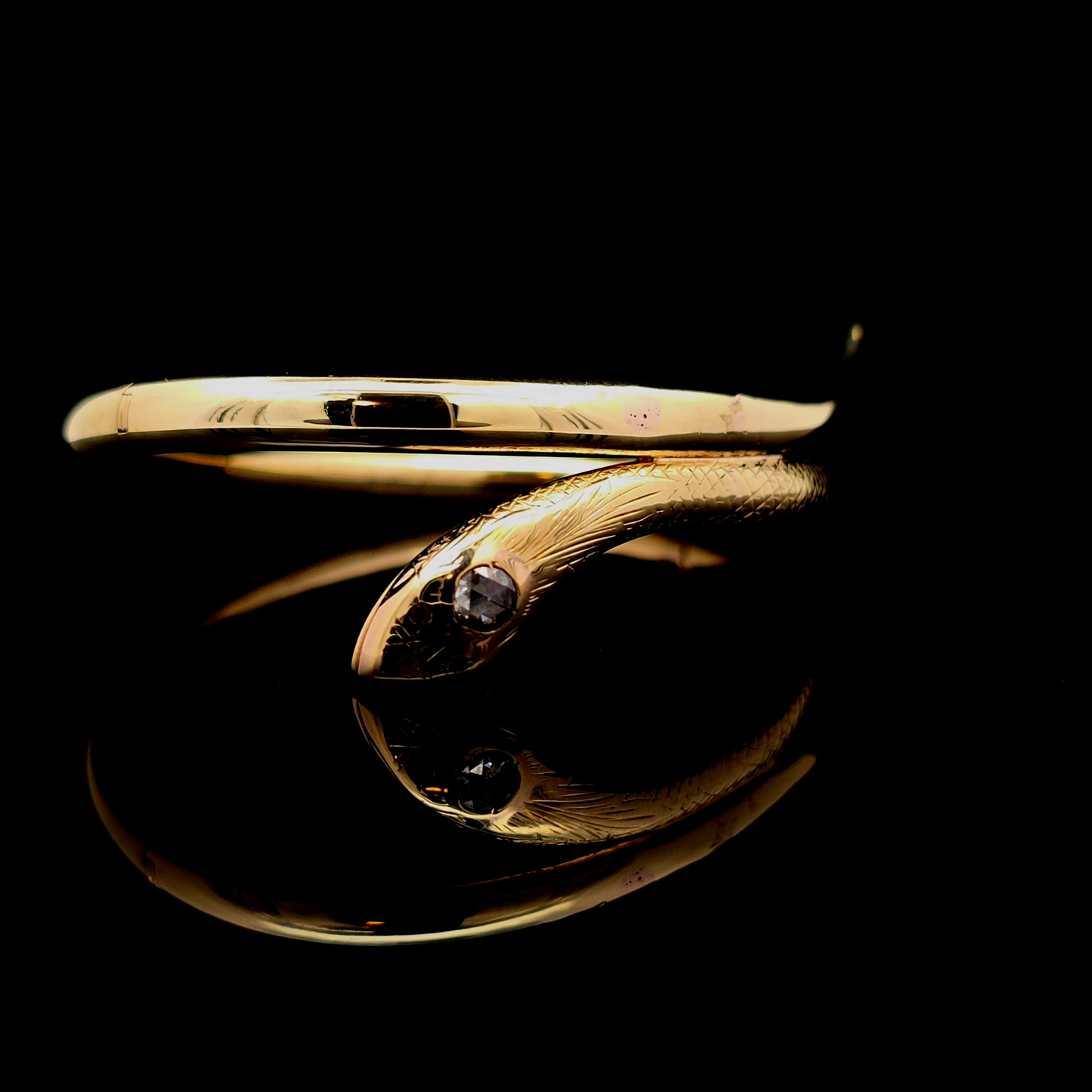 A captivating yellow gold snake ring featuring a bypassing serpent design with intricate scale engraving. The snake's head is flush-set with a single round rose-cut diamond, while the tail tapers elegantly. This piece showcases a polished finish and a high-relief textured composition for a sophisticated yet bold aesthetic.