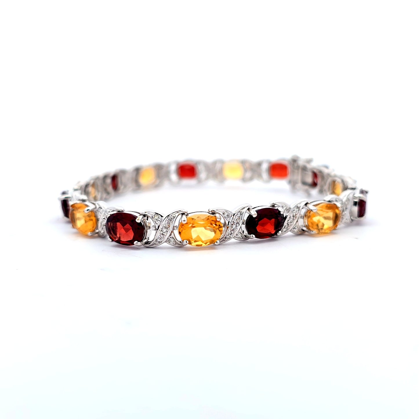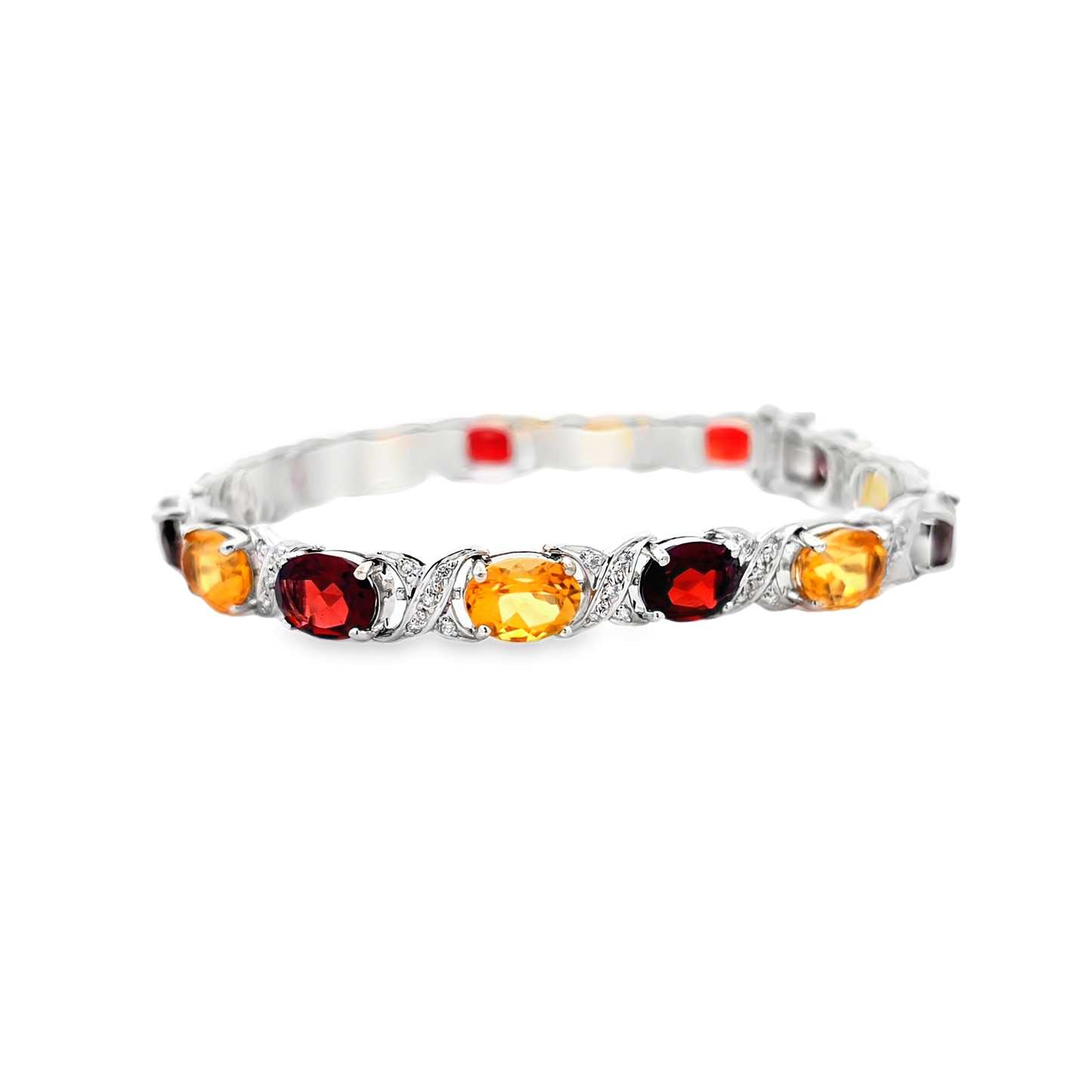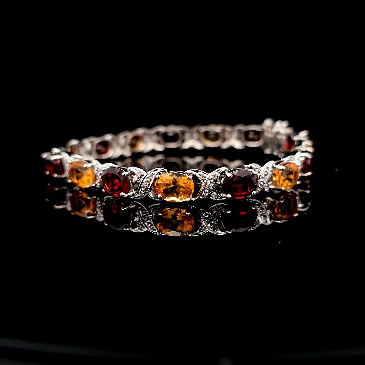 An elegant white gold tennis bracelet featuring alternating oval mixed-cut citrine and garnet gemstones. Each vibrant stone is set within a four-prong mount, separated by polished X-shaped white gold links accented with small round diamonds. The piece is secured with a discrete box clasp and safety latch.