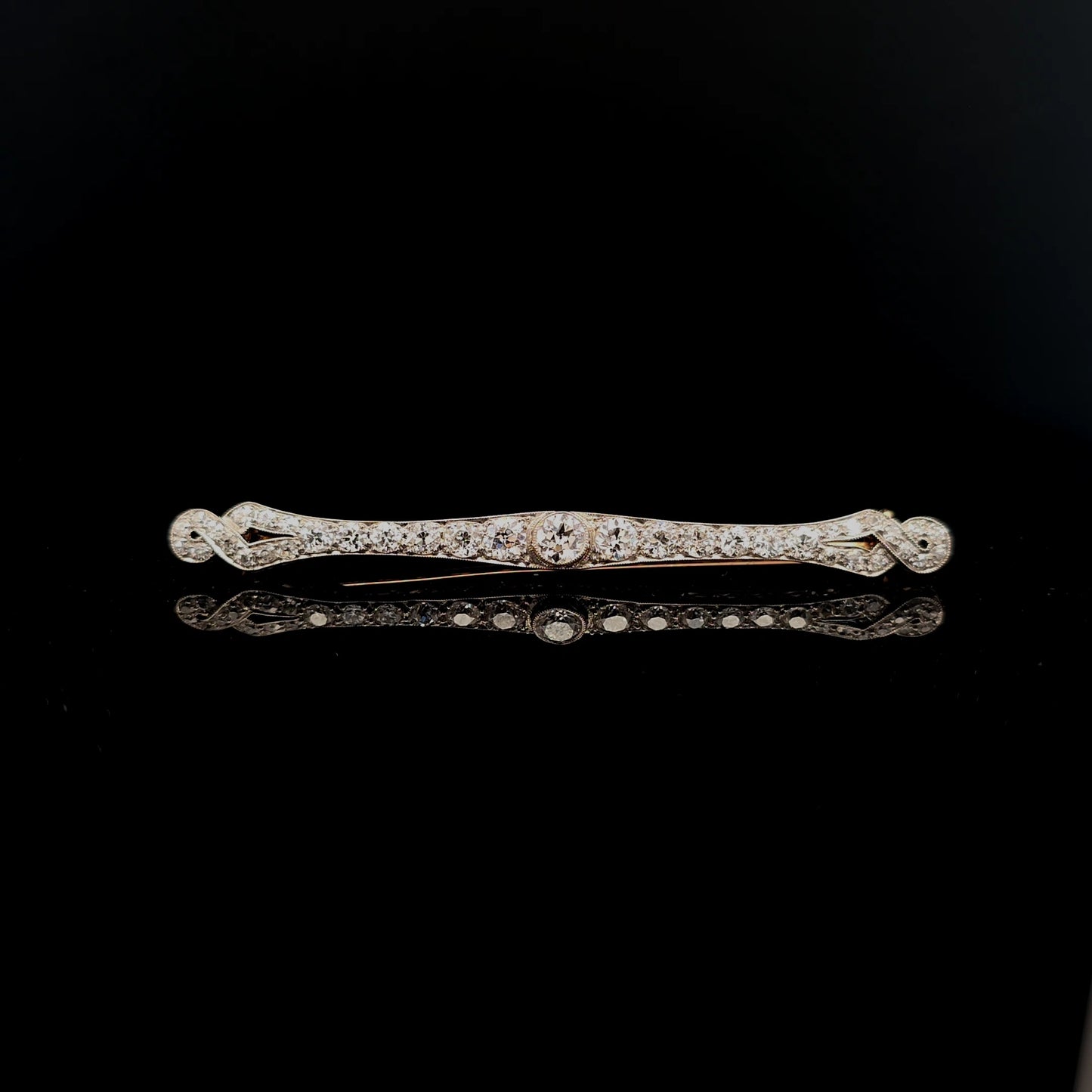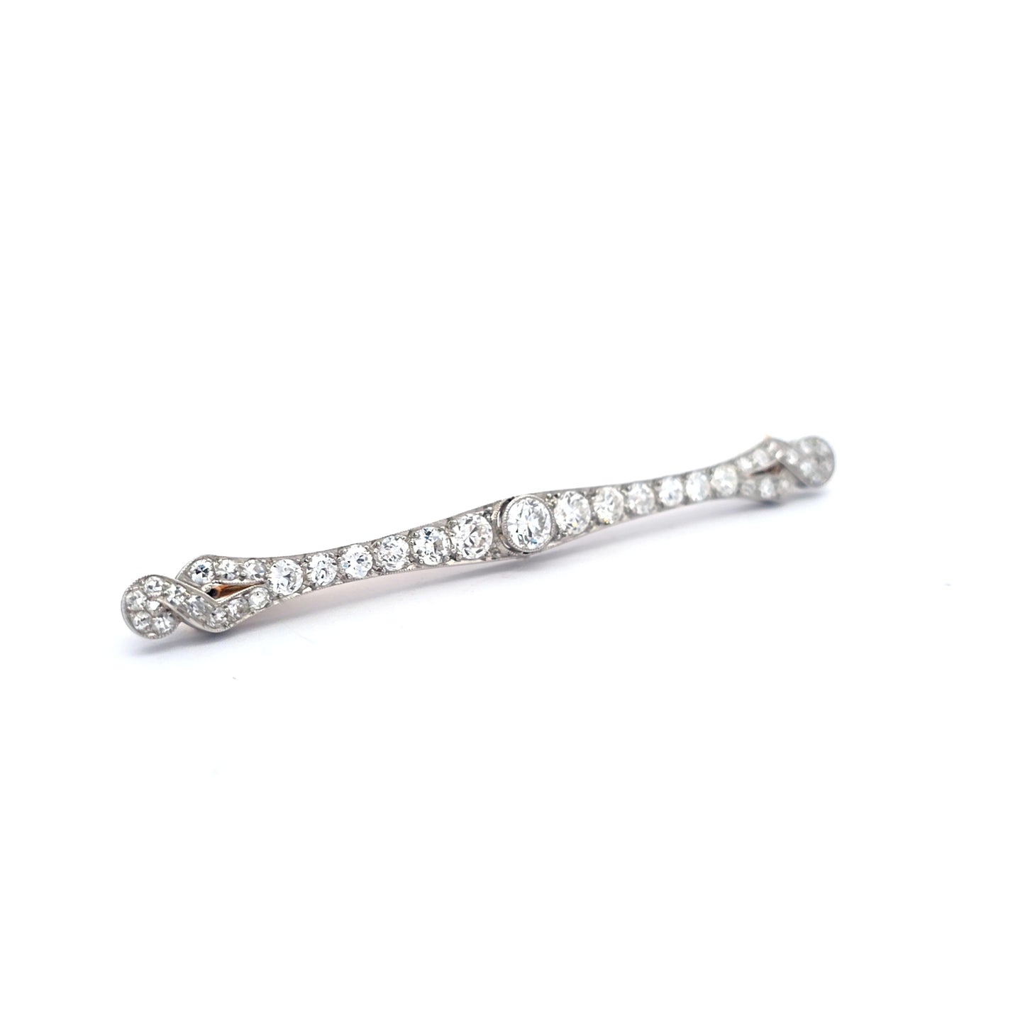 This exquisite Edwardian-style bar brooch is crafted in white gold and features a graduated row of round brilliant-cut diamonds. The central diamond is bezel-set, flanked by grain-set diamonds leading to ornate, milgrain-edged knot motifs at either end. Each stone exhibits exceptional clarity and a high-polish finish, creating a continuous line of brilliance.