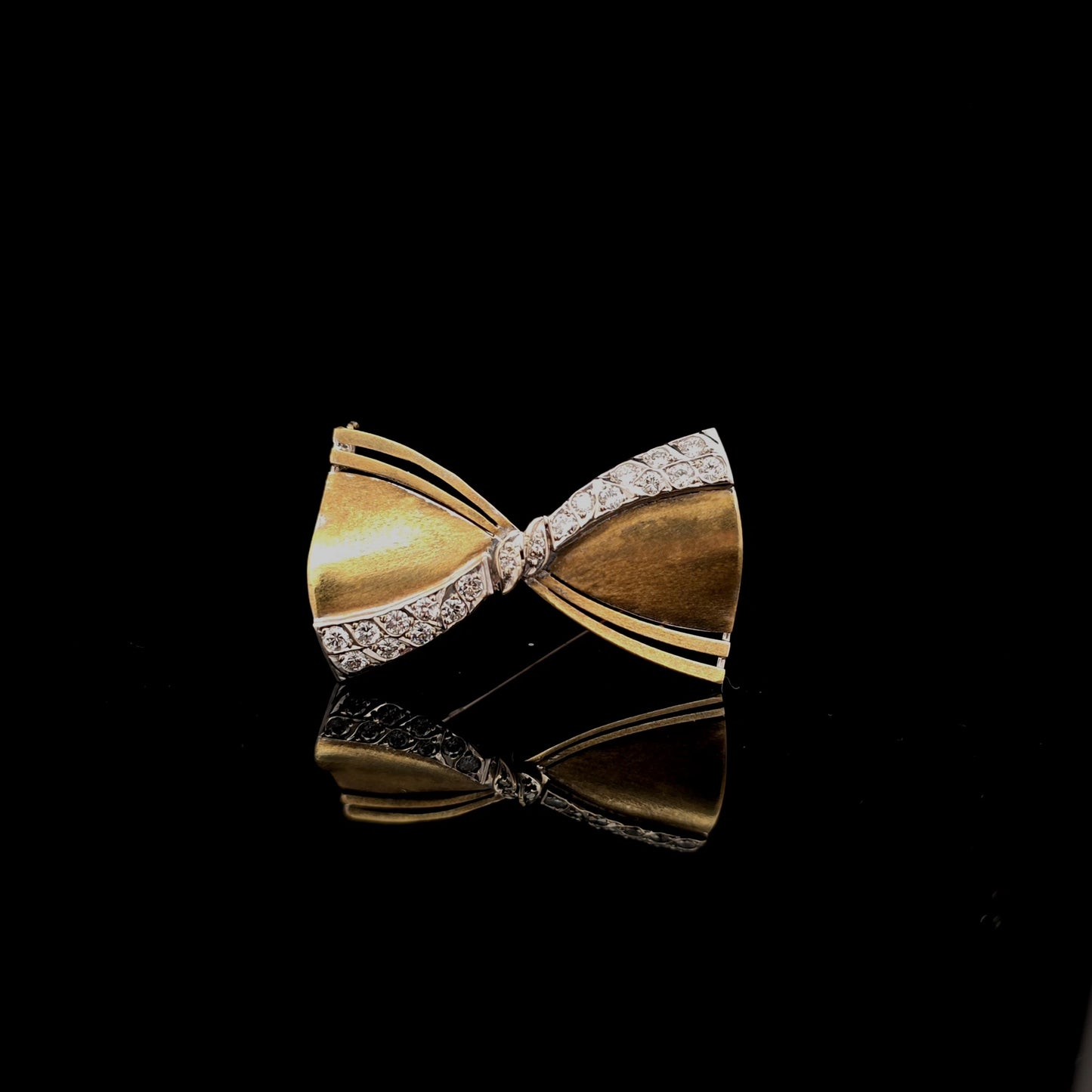 Exquisite bow-shaped brooch featuring textured yellow gold ribbon loops. One side and the central knot are accented with round brilliant-cut diamonds pavé-set in white gold for a sophisticated contrast. The piece showcases professional polish, excellent symmetry, and brilliant clarity in a refined two-tone design.