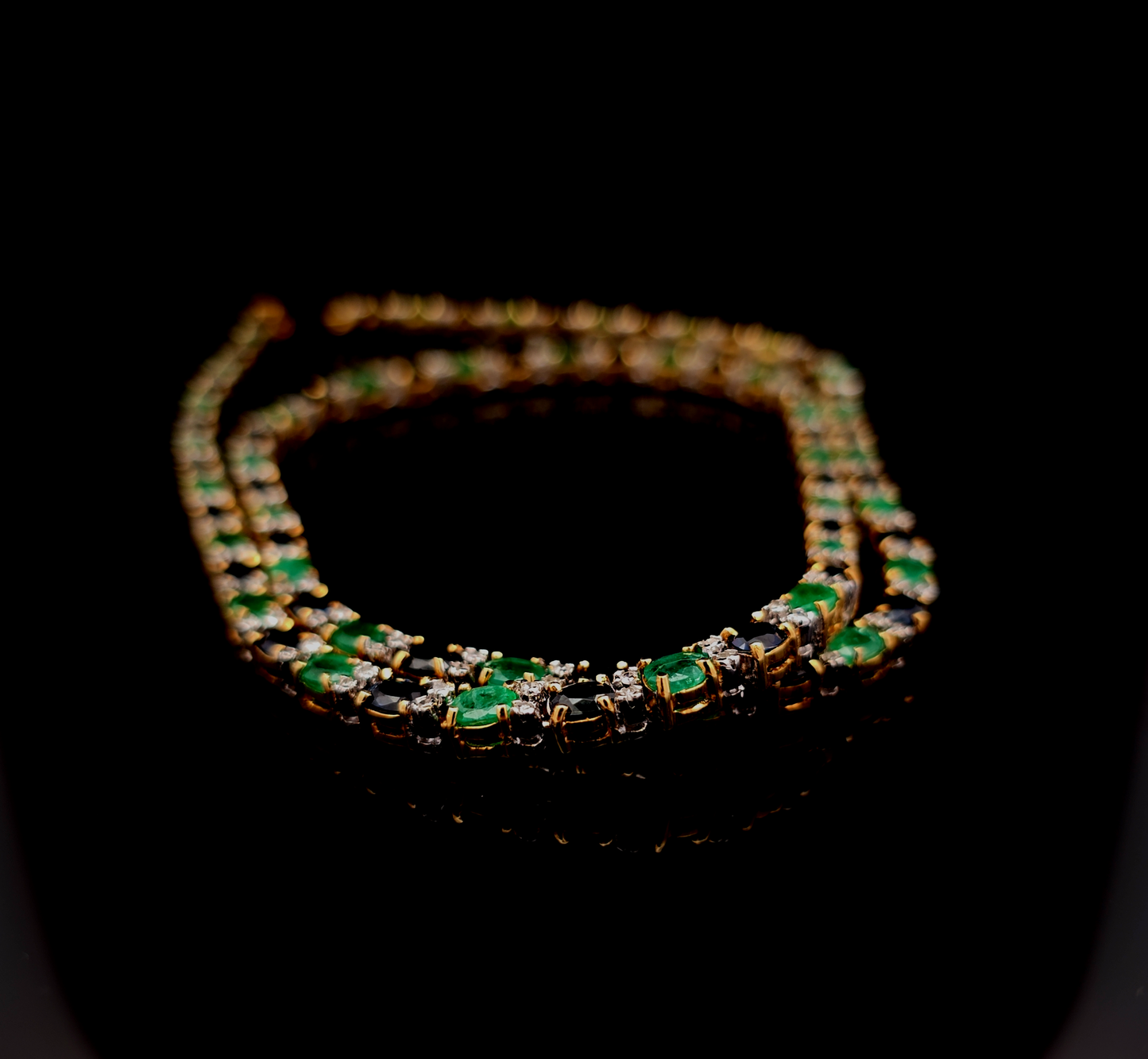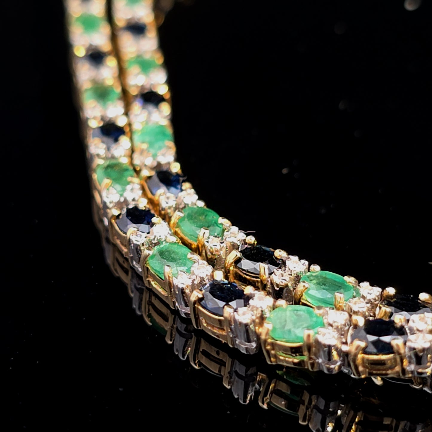 An elegant yellow gold necklace featuring a sequence of mixed-cut oval emeralds and sapphires. The vibrant green stones are accented by small round diamonds and dark sapphire accents in a sophisticated prong setting, offering a refined multi-gemstone arrangement with a polished finish and excellent symmetry.