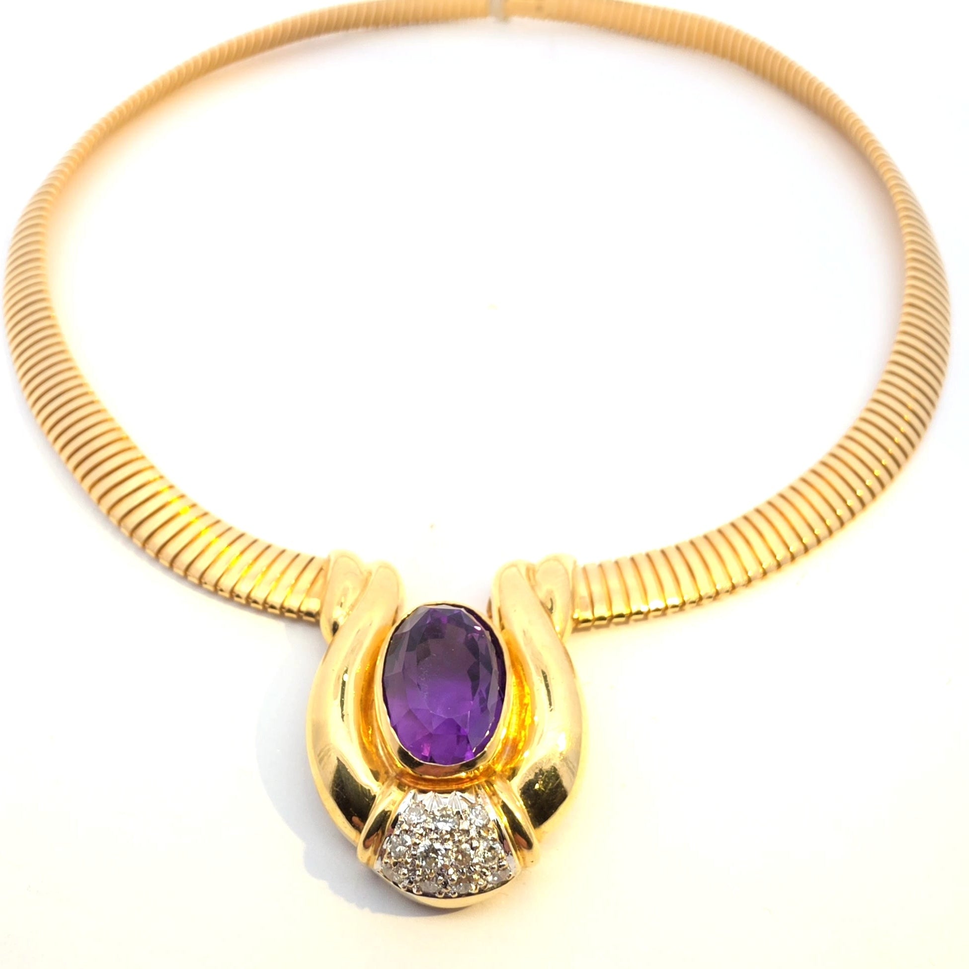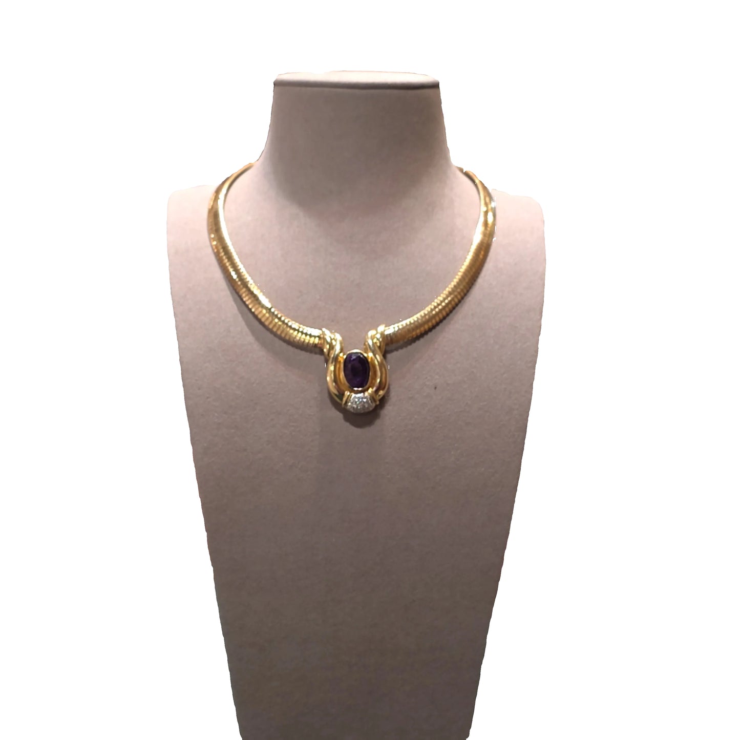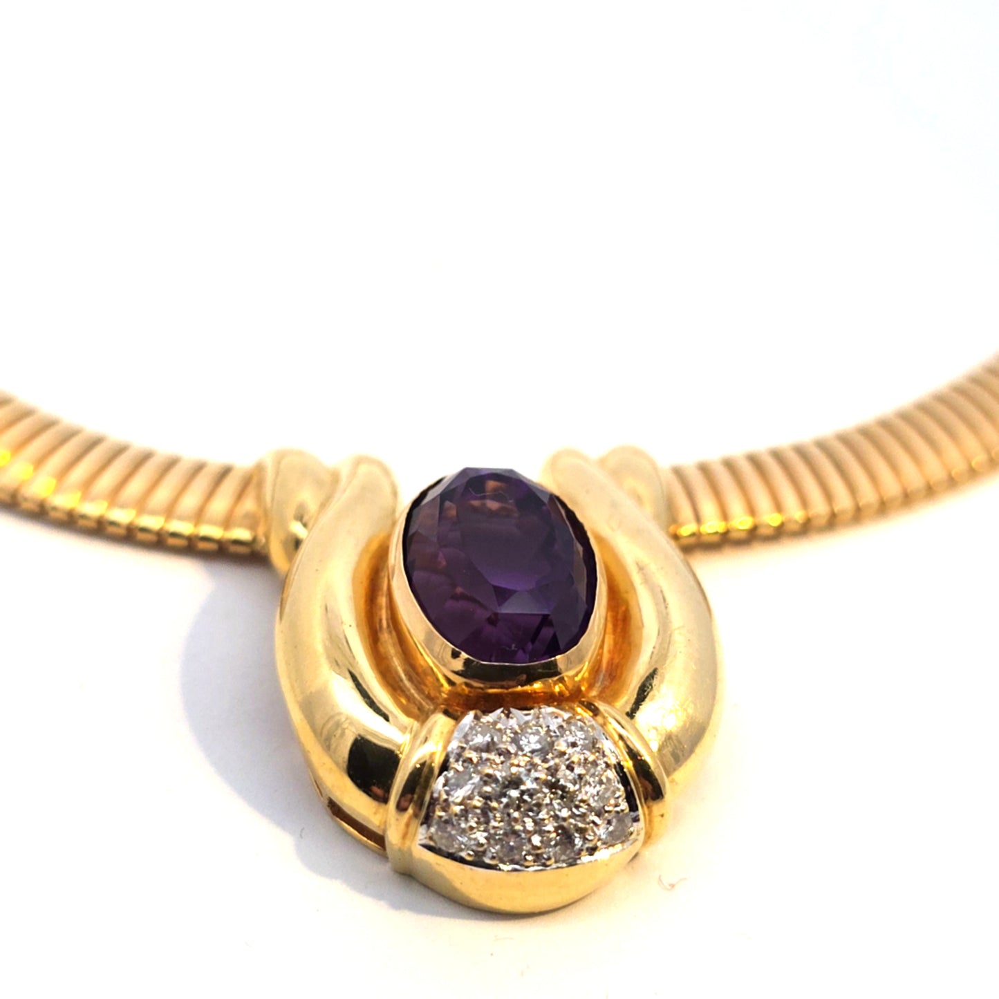 Indulge in the allure of this exquisite charm necklace. The focal point is a captivating oval-shaped amethyst, set in a warm, radiant yellow gold. This charm necklace exudes a sense of timeless elegance and sophistication, making it the perfect accessory for any occasion.