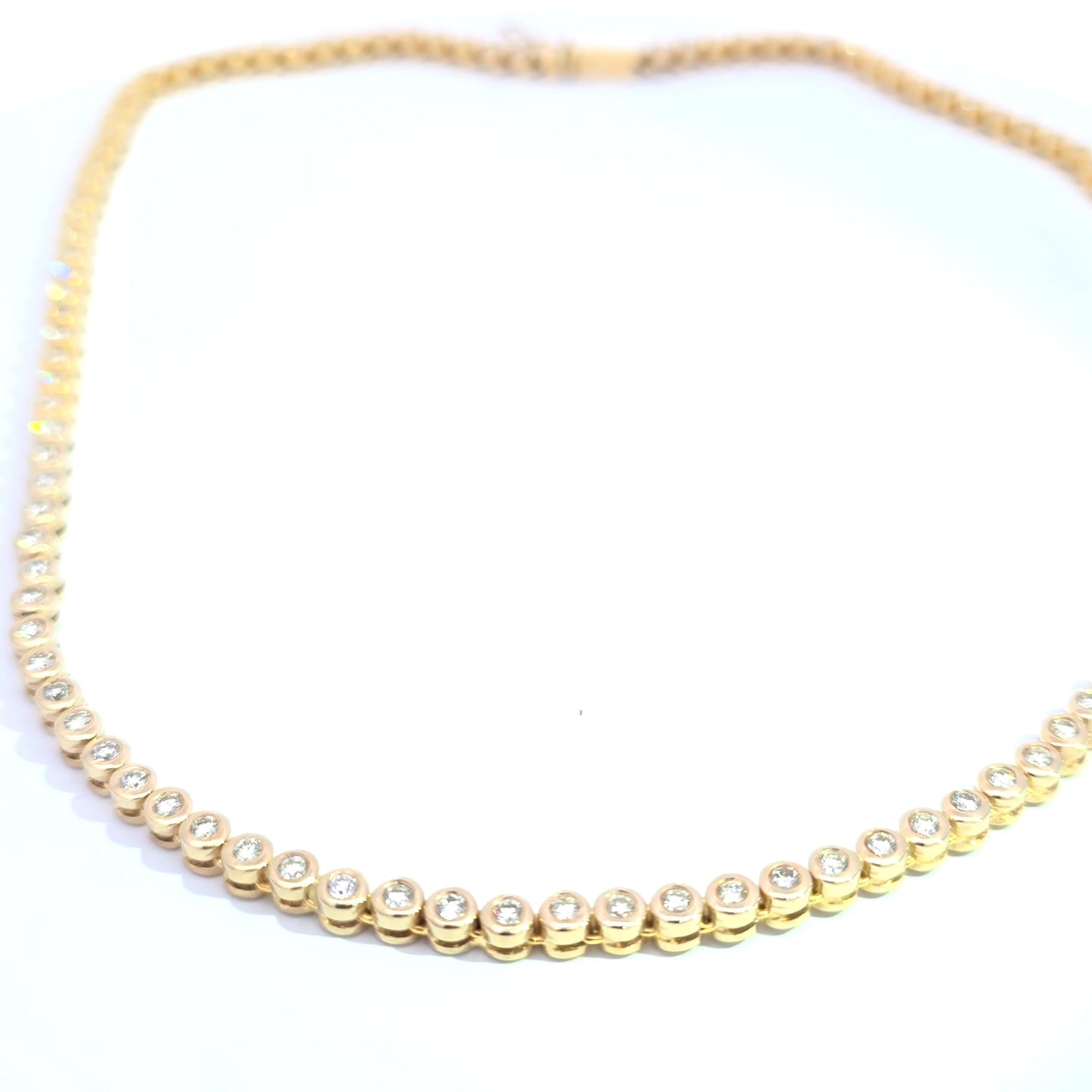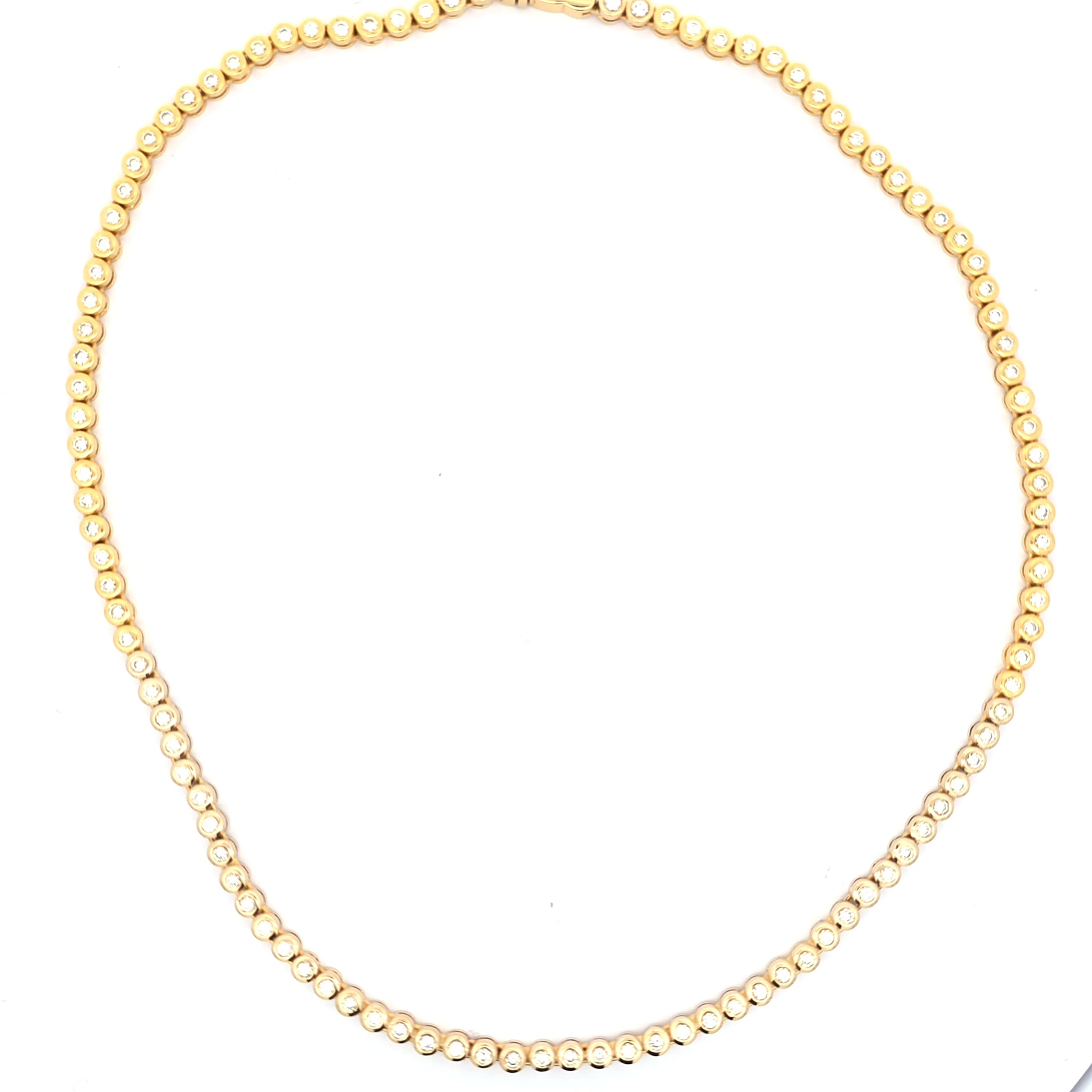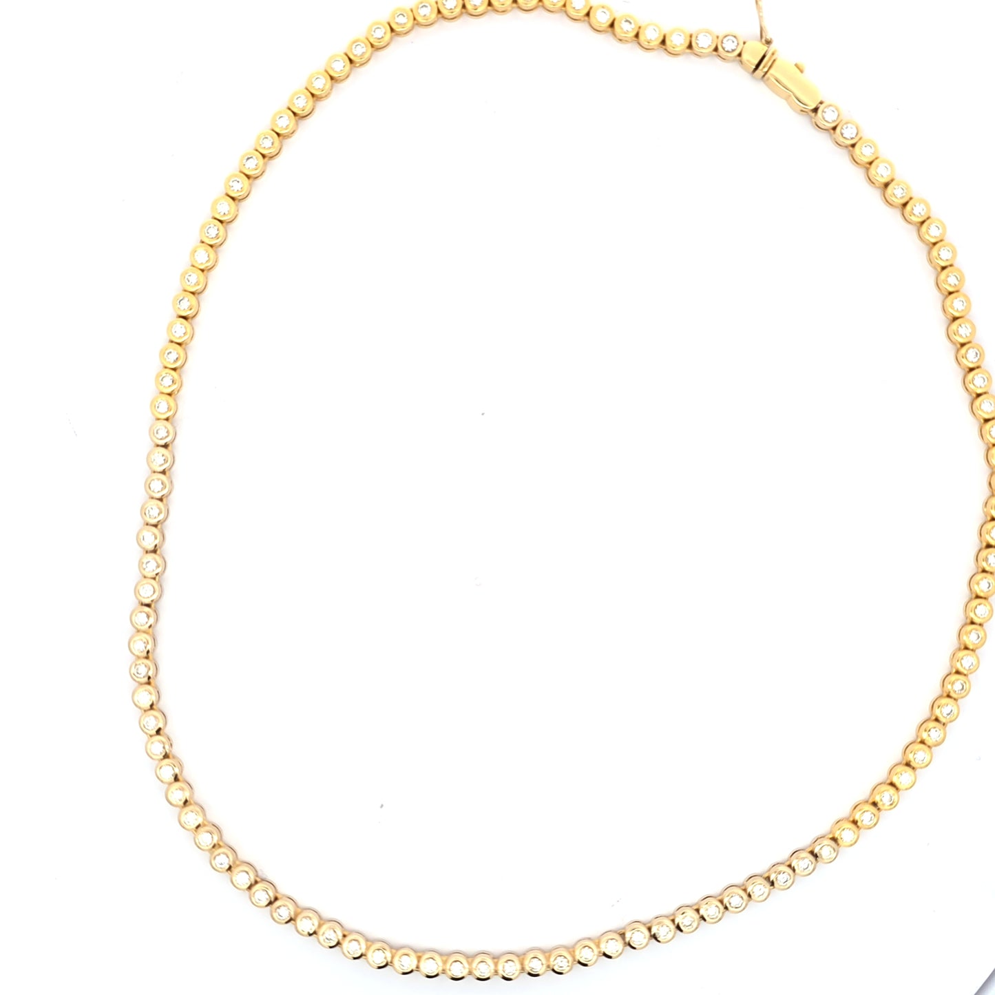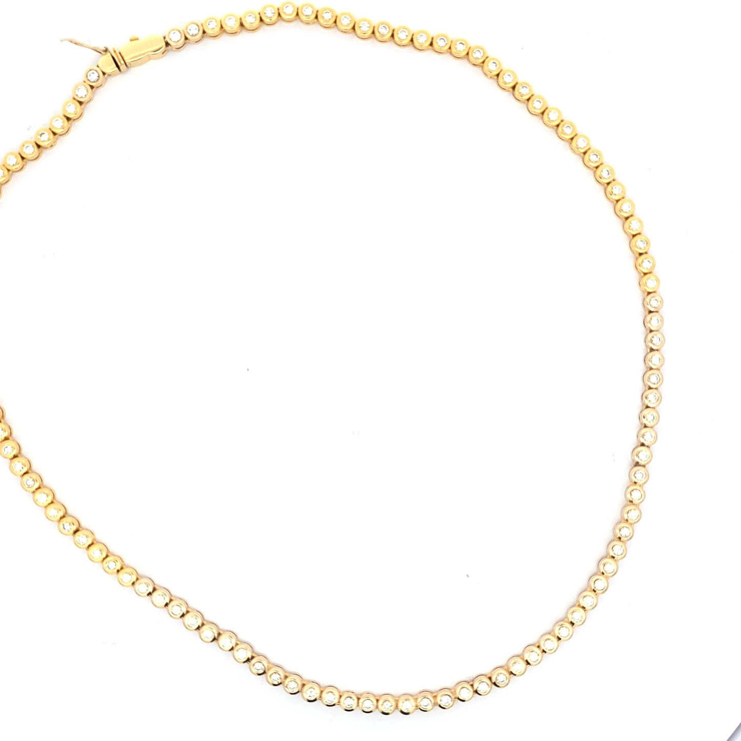 Elevate your style with this exquisite diamond necklace, meticulously crafted in warm 18ct yellow gold. The timeless design showcases a series of 107 0,04ct brilliant-cut, round diamonds set closely together, creating a continuous line of radiance. This classic diamond necklace offers a touch of understated glamour for any occasion.