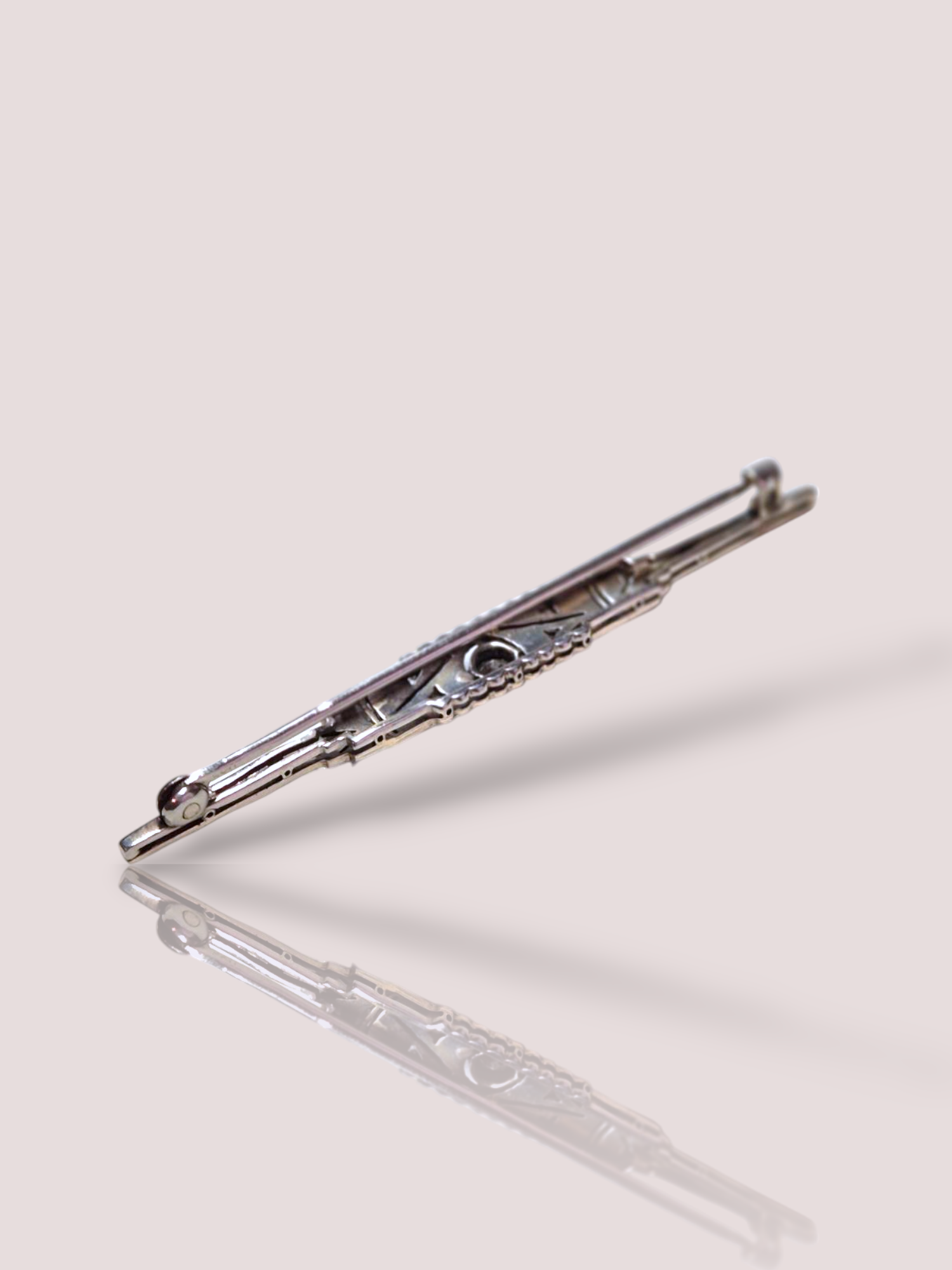 Deze prachtige 14k witgouden Art-Deco broche is bezet met een centrale fonkelende diamant van 0,20 karaat en heeft een elegant en tijdloos design. De broche kan gedragen worden op een colbert, jurk, sjaal of zelfs op een tas. De combinatie van het witgoud en de diamant zorgt voor een chique uitstraling die de perfecte finishing touch geeft aan elke outfit. Geef je look een vleugje glamour met deze schitterende broche! De broche is 6 cm breed en zorgt voor een elegante verschijning waar je ook komt.