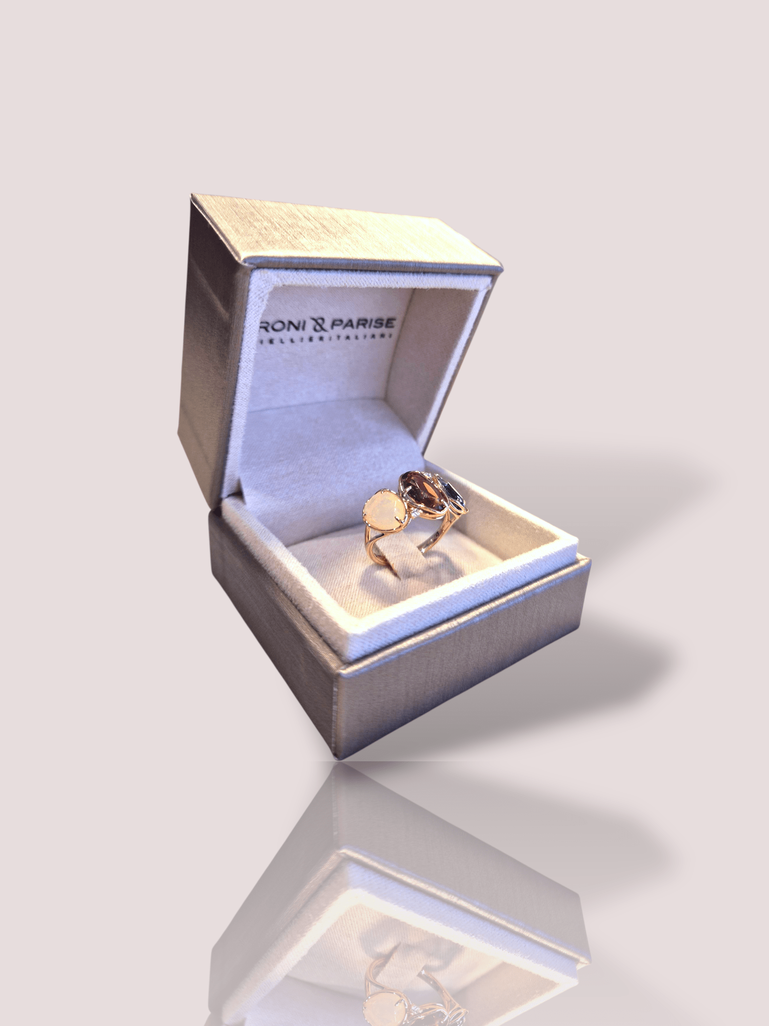 Deze 18k rosé gouden Peroni & Parise fantasiering is een verfijnd sieraad met gekleurde edelstenen. Het is een luxe accessoire dat elke outfit verrijkt. De ring bevat een blauwe London Blue topaz, een prachtige toermalijn in een rose tint en een melkopaal. Deze edelstenen worden gesierd door 2 diamanten van 0,04ct in een G kleur met zeer kleine insluitsels.