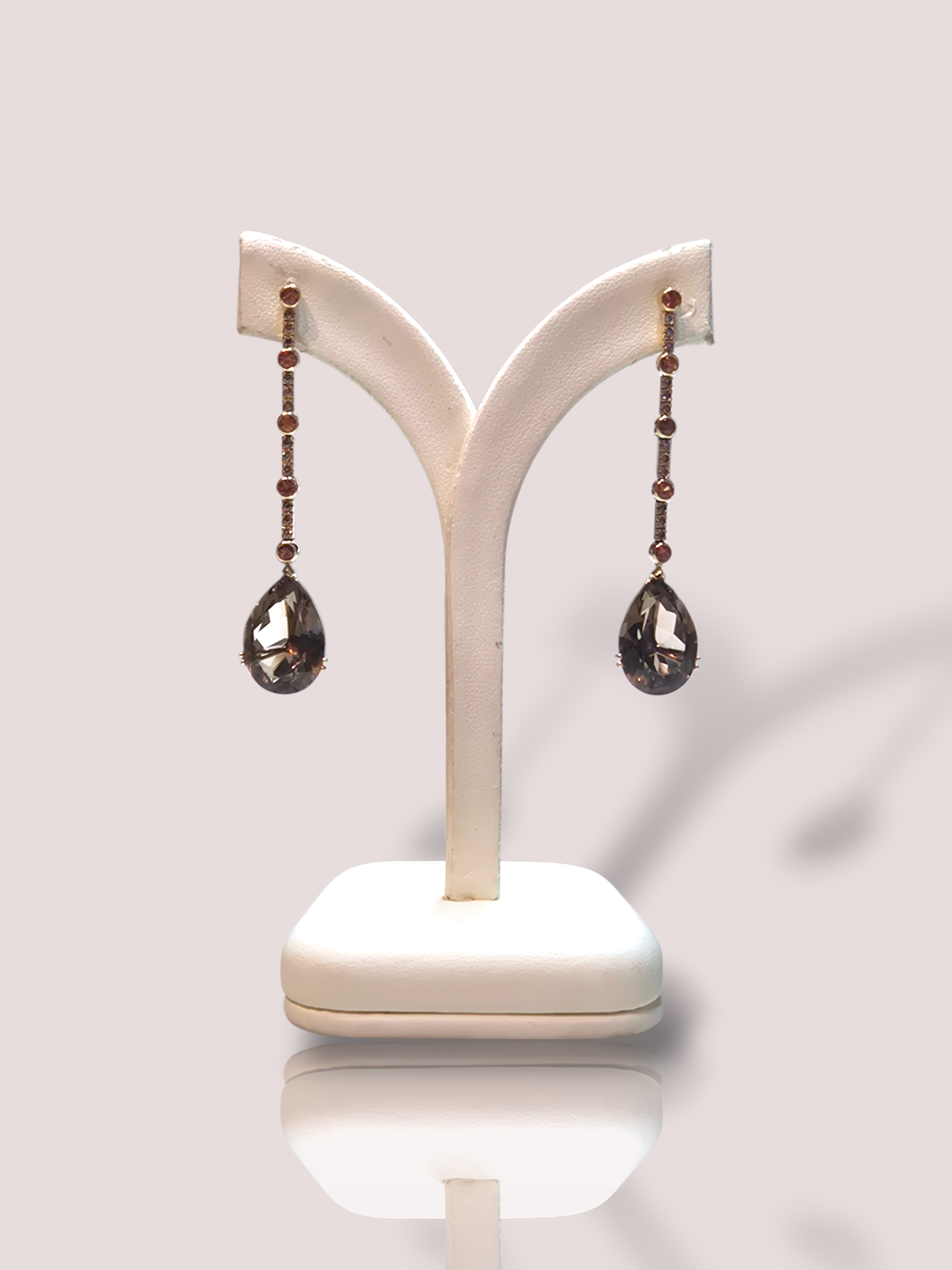 De Vintage 18k geel gouden oorbellen met rookkwarts, saffier en diamanten,  zijn prachtige juwelen die elegantie uitstralen. Deze hanger oorbellen combineren de warme gloed van geel goud met de mysterieuze uitstraling van rookkwarts en het fonkelen van oranje saffier en bruine diamanten. Draag ze bij een stijlvol avondje uit of bij een chique gelegenheid voor een verfijnde look.