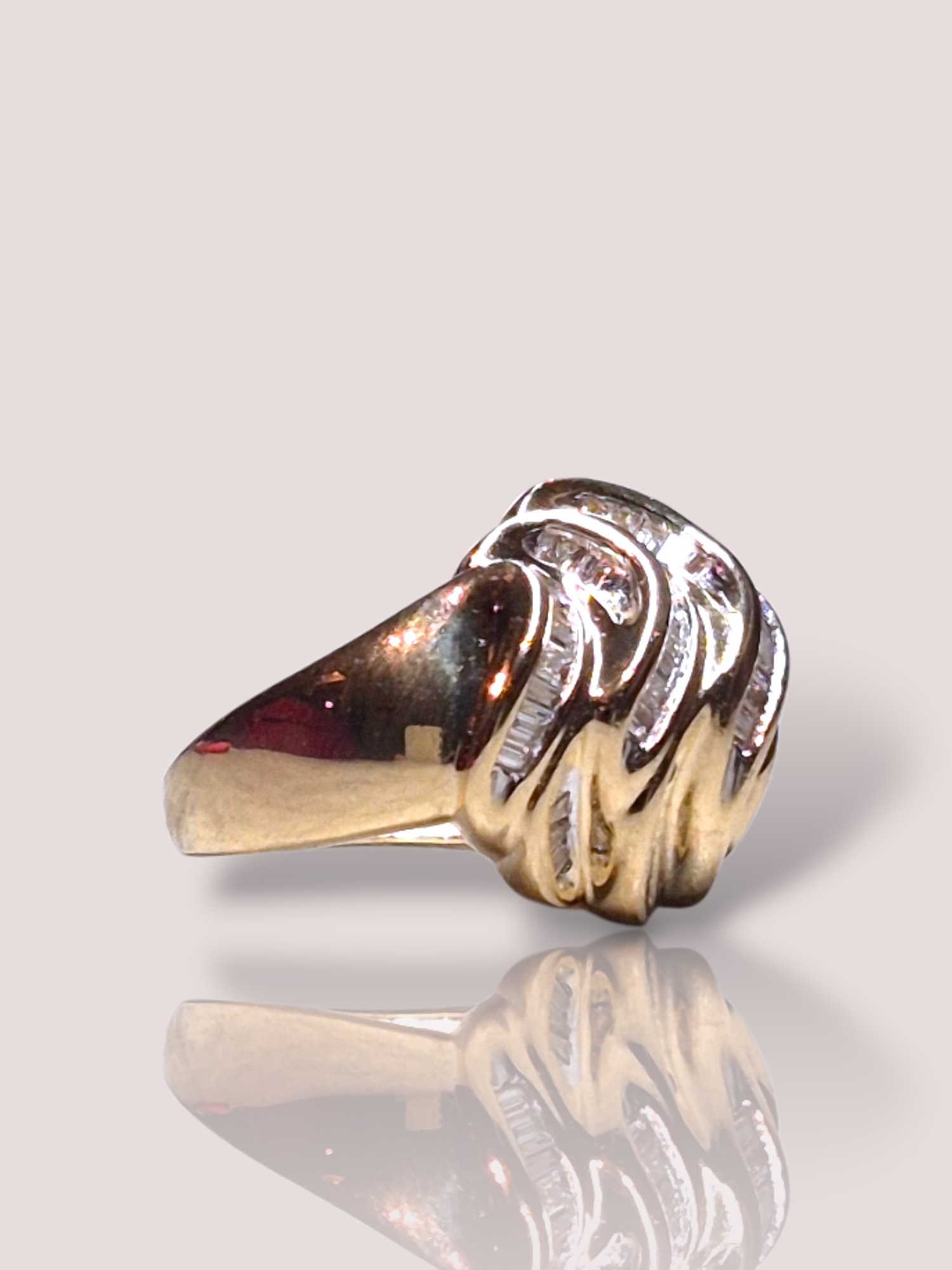 De Vintage 18k geelgouden ring is een prachtige ring met schitterende diamantbaguettes die elegantie en verfijning toevoegen aan elke look. Het beste te dragen om speciale gelegenheden te accentueren; combineer het met subtiele sieraden voor een harmonieuze uitstraling.