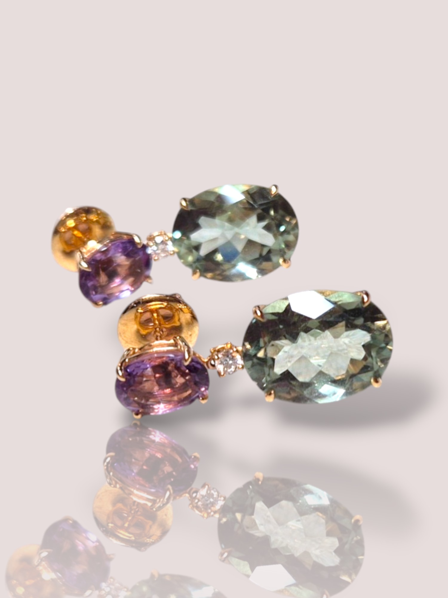 De Vintage 18k roségouden oorbellen zijn voorzien van amethist, prasioliet en diamanten. Deze opvallende hangende oorbellen stralen luxe en elegantie uit. Perfect te dragen bij formele gelegenheden of om een stijlvolle outfit compleet te maken. Combineer ze met een opgestoken kapsel om de glans en kleuren optimaal te laten zien.
