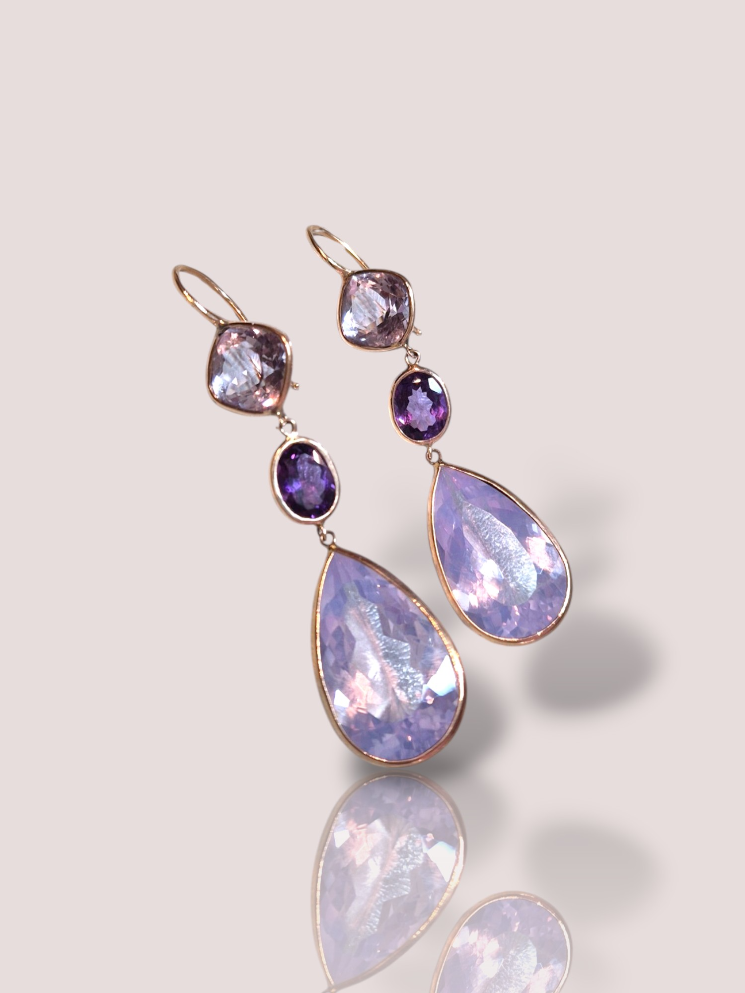 De oorhangers zijn 7 cm lang en bevatten 2 kleuren amethist, paars en roze.