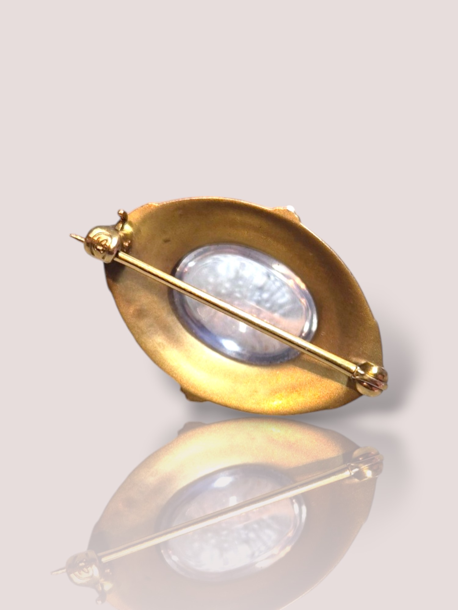 De Vintage 14k geel gouden broche met maansteen en zaadpareltjes is een elegant juweel. Deze broche straalt verfijning uit en is ideaal om uw outfit een klassieke touch te geven. Draag hem op een blouse of jurk voor een chique accent. Perfect voor speciale gelegenheden of om uw dagelijkse look te verfraaien.