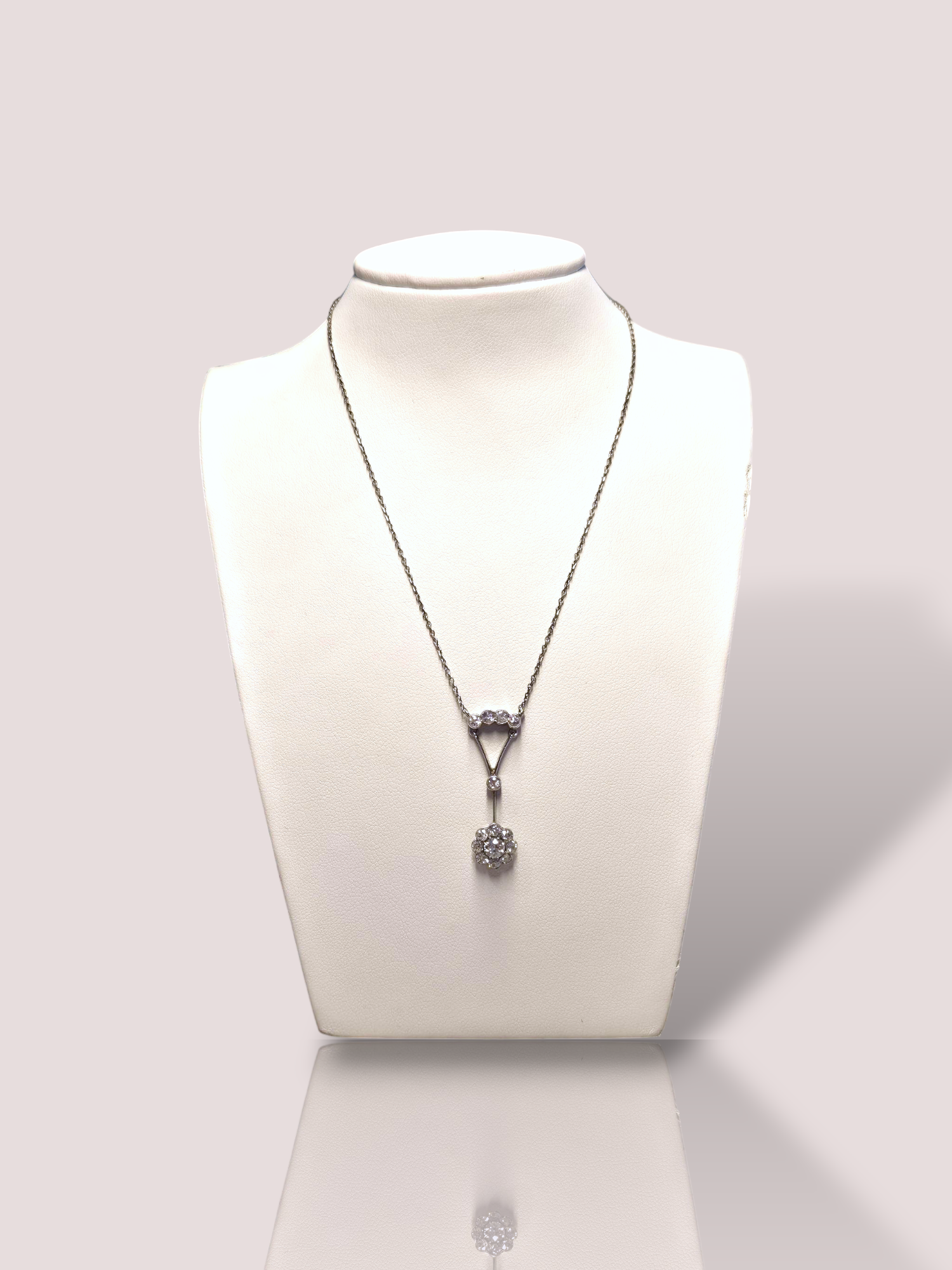 De hanger bestaat uit 14 diamanten, waarvan de center stone een 0,25 Bolsjewiek geslepen diamant is. Het collier is 40 cm lang en valt prachtig elegant om de hals.