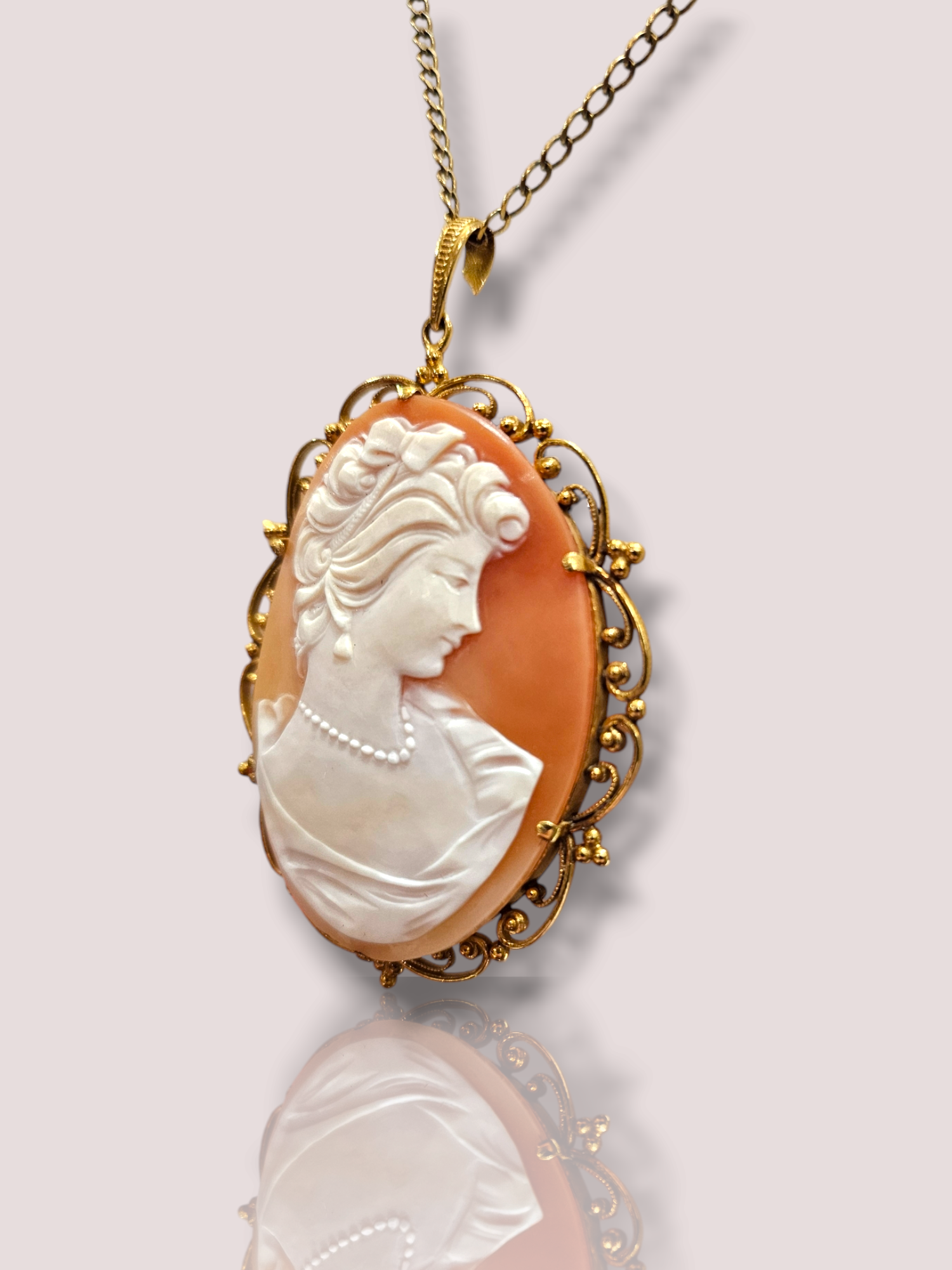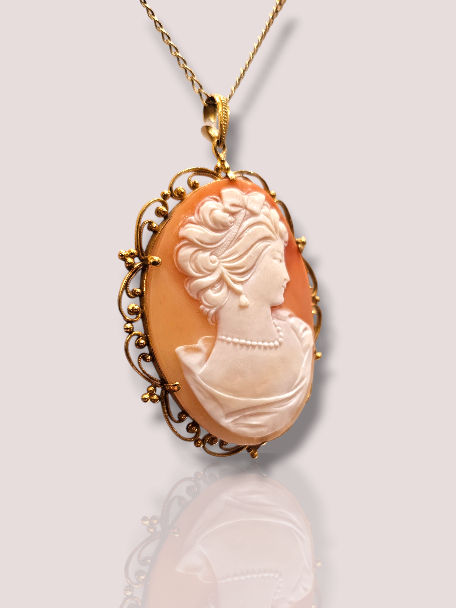 Deze prachtige antieke 20k geelgouden camee hanger is gemaakt van schelp en heeft een uniek design. De hanger heeft een klassieke uitstraling en is perfect voor het toevoegen van een vleugje vintage glamour aan elke outfit. Draag deze hanger met een eenvoudige gouden ketting voor een stijlvolle look. Perfect voor zowel dagelijkse outfits als speciale gelegenheden. De hanger is 4,5 bij 5,5 cm en weegt 16,8 gram.