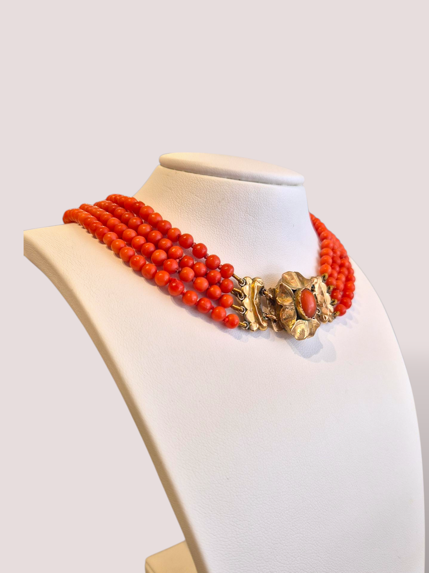 Dit antieke 4-rijig bloedkoralen collier met 14k gouden slot is een elegante halsketting. Met zijn vier rijen bloedkoralen en een stijlvol 14k gouden slot, is het een prachtige aanvulling op elke outfit. Draag het als blikvanger op een ingetogen outfit voor een klassieke, verfijnde uitstraling. De bloedkoralen zijn zeer gelijk qua grootte en hebben een dikte van 4,3 mm.