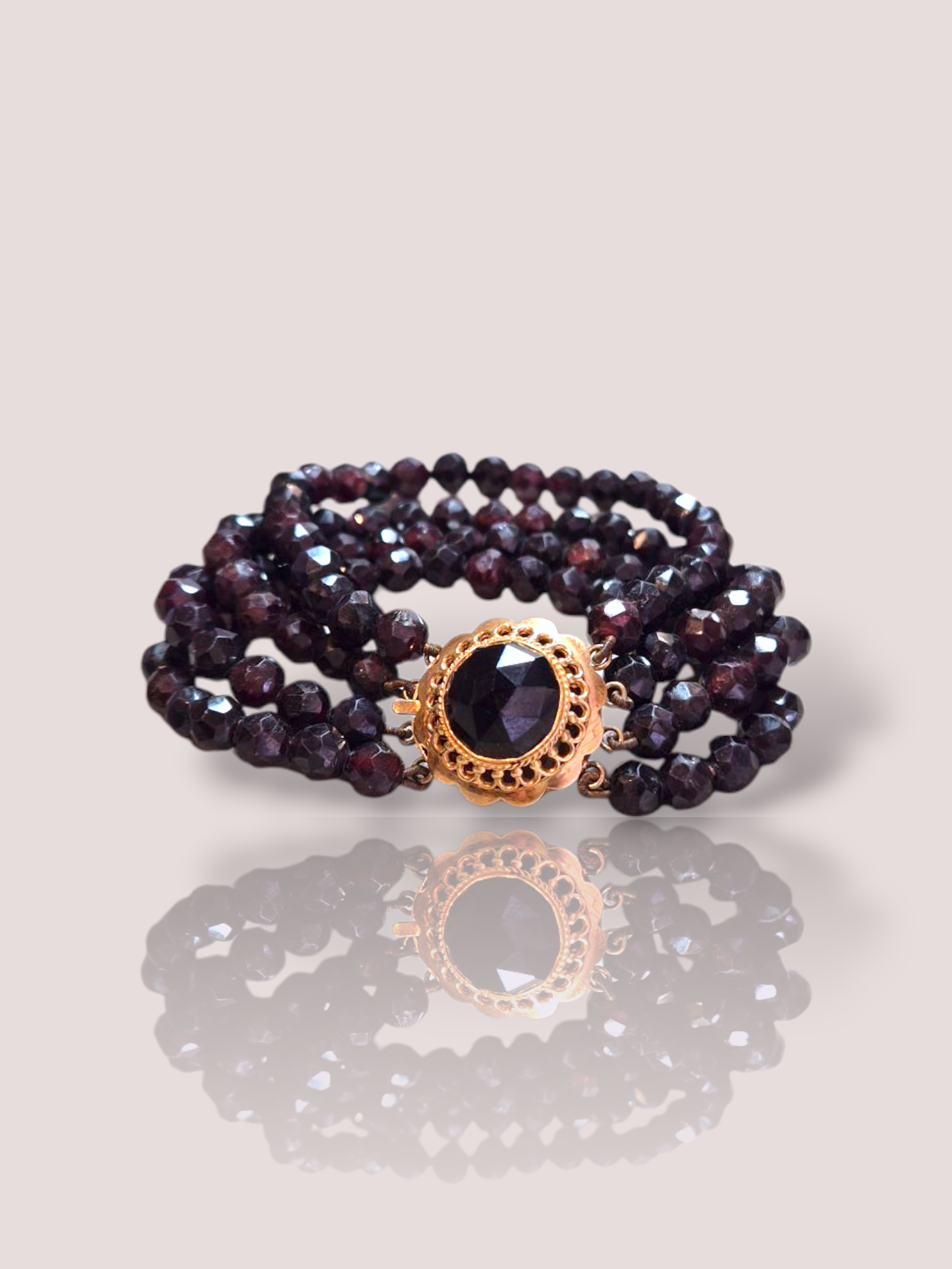 Deze antieke 4-rijige granaat armband straalt elegantie uit met vier rijen schitterende granaatstenen. De armband heeft een 14k geel gouden slotje. Perfect als verfijnde aanvulling op elke outfit.