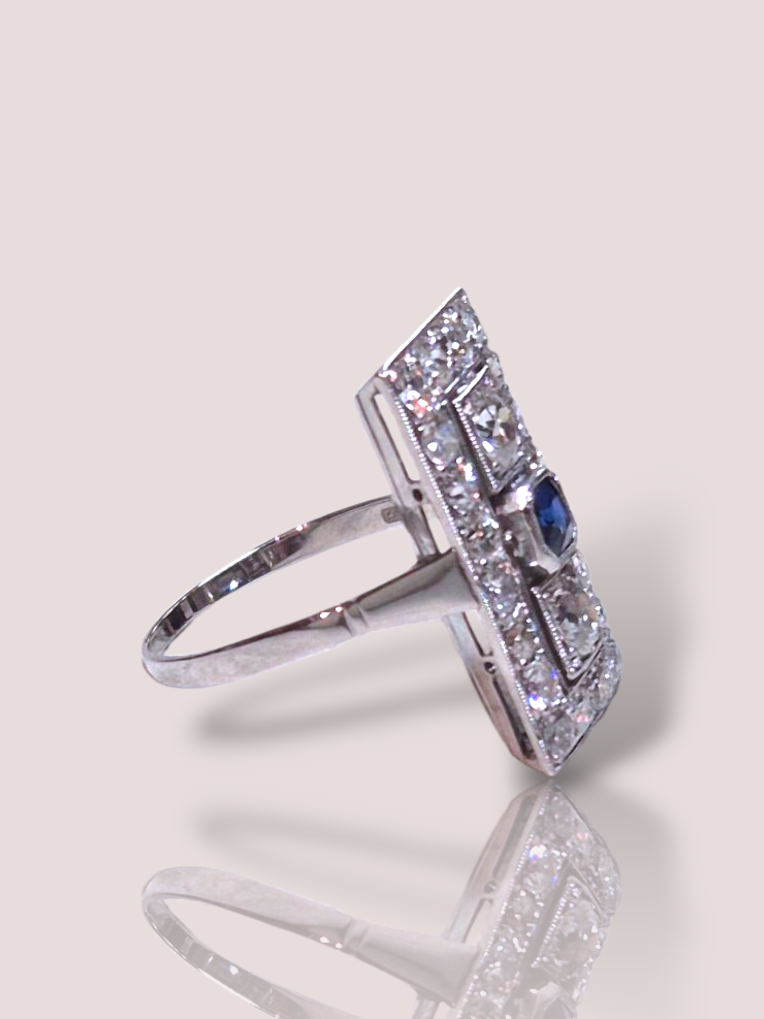 Deze Art-Deco 14k witgouden en platina ring is een verfijnd sieraad met schitterende diamanten en een diepe, blauwe saffier. Perfect voor speciale gelegenheden of als opvallend accessoire bij alledaagse outfits. Draag deze ring solo voor een elegante look of combineer met andere sieraden voor extra glamour.