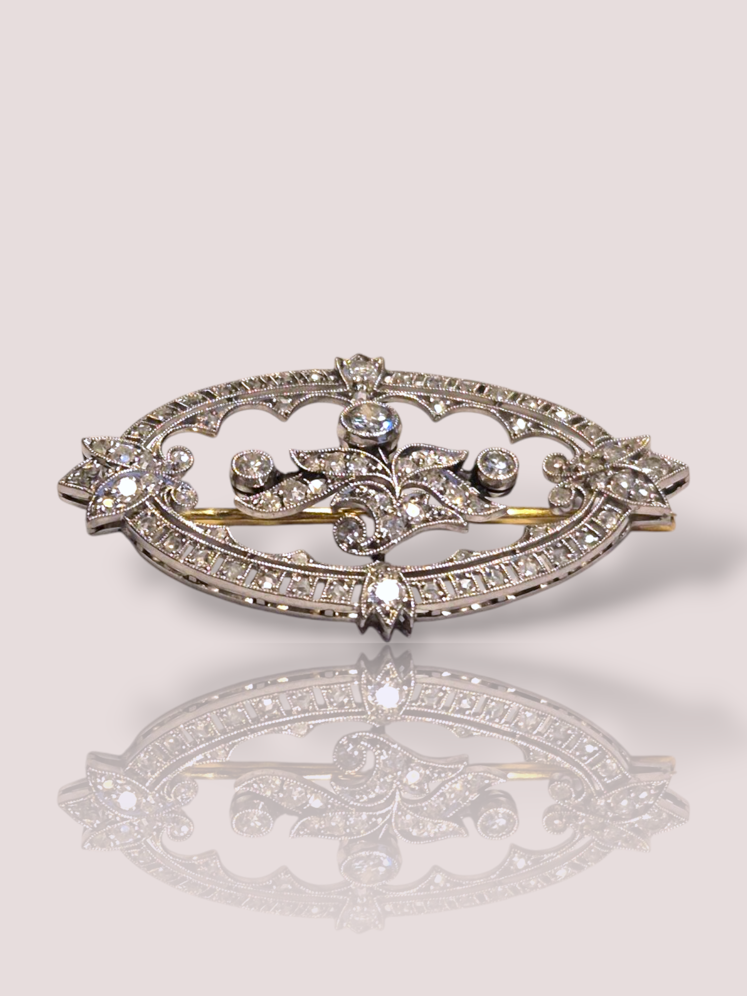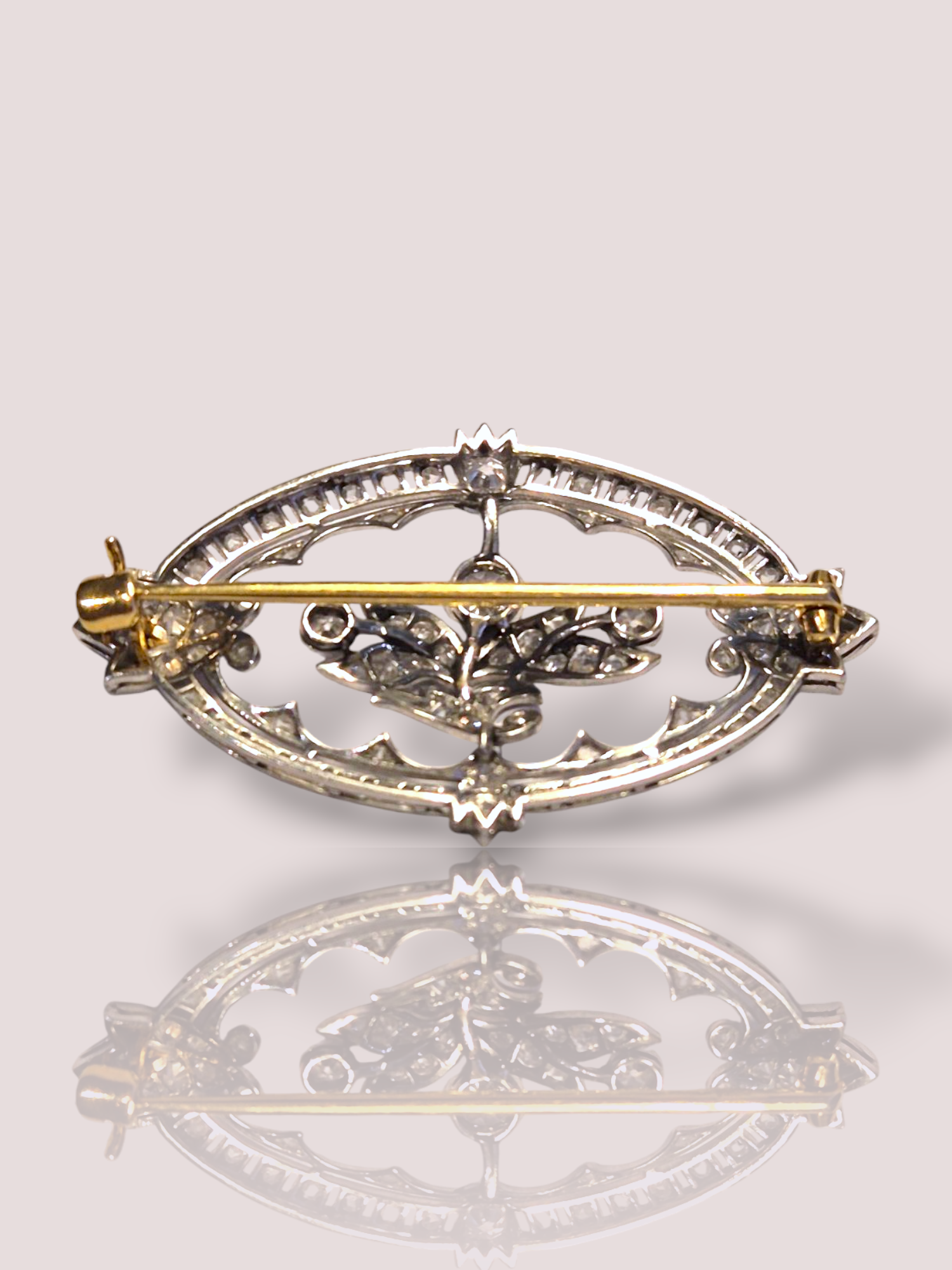 De broche is 6 bij 3 cm en bevat 77 diamanten in roosvorm en oud slijpsel geslepen.