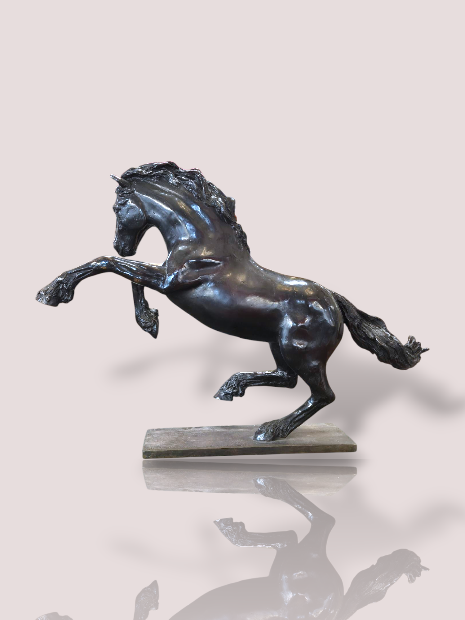 Het product Bronzen beeld Ida van kunstenaarsduo Jean Marianne Bremers is een verfijnd kunstwerk met de beeltenis van een steigerend paard. Dit kunstwerk straalt elegantie, kracht en tijdloze schoonheid uit. Het brons is prachtig diep donker van kleur wat het geheel een nog krachtigere uitstraling geeft. Van dit beeld zijn 6 sculpturen gemaakt, dit sculptuur is nummer 5 van 6. Het beeld is circa 61 cm breed en 43 cm hoog.