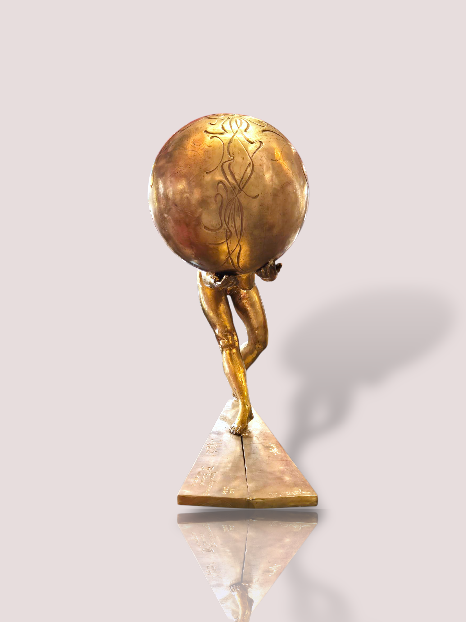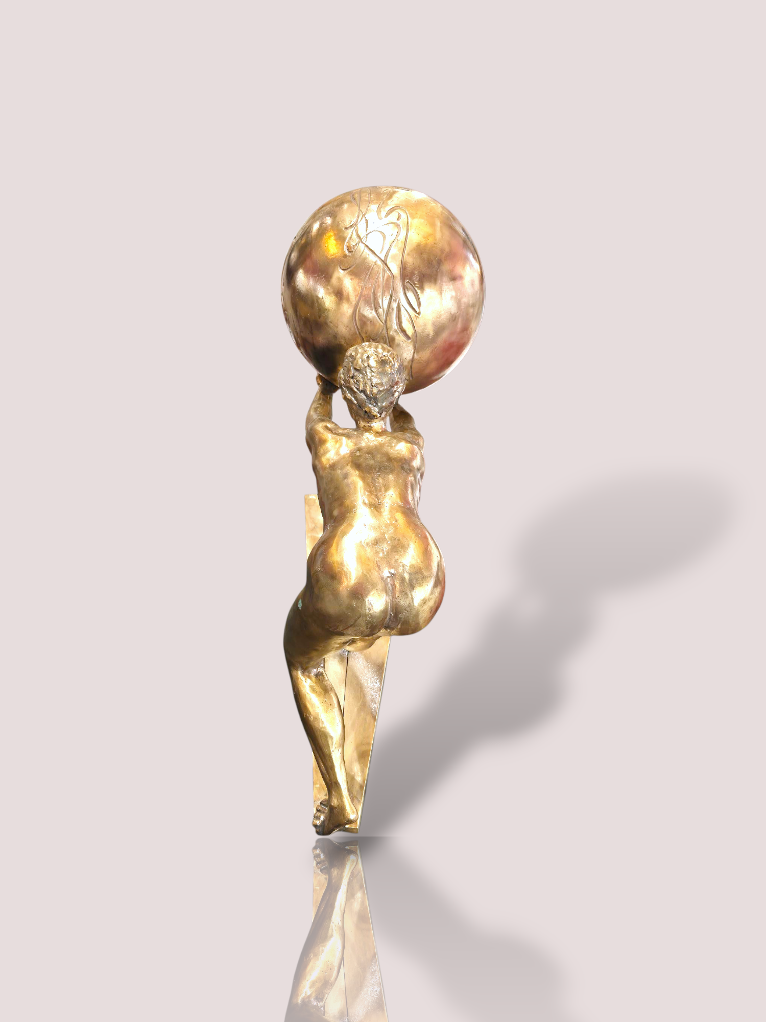 Dit Bronzen sculptuur Atlante van kunstenaarsduo Jean Marianne Bremers is een verfijnd kunstobject met de beeltenis van een vrouw die de wereld als een bol in haar handen draagt. Een extra mooi element aan dit beeld is de kleur van het beeld, een prachtige warm gouden bronskleur.