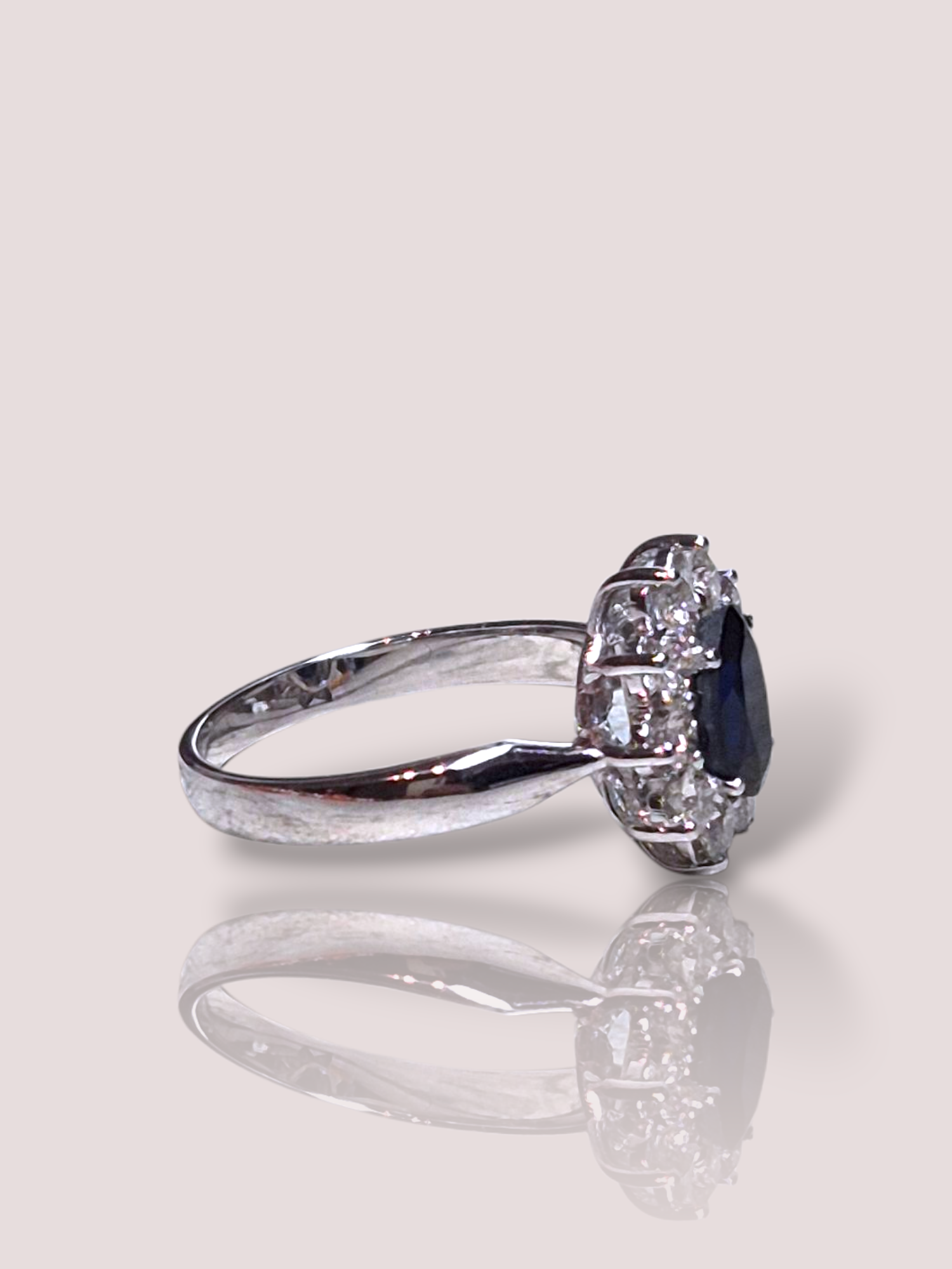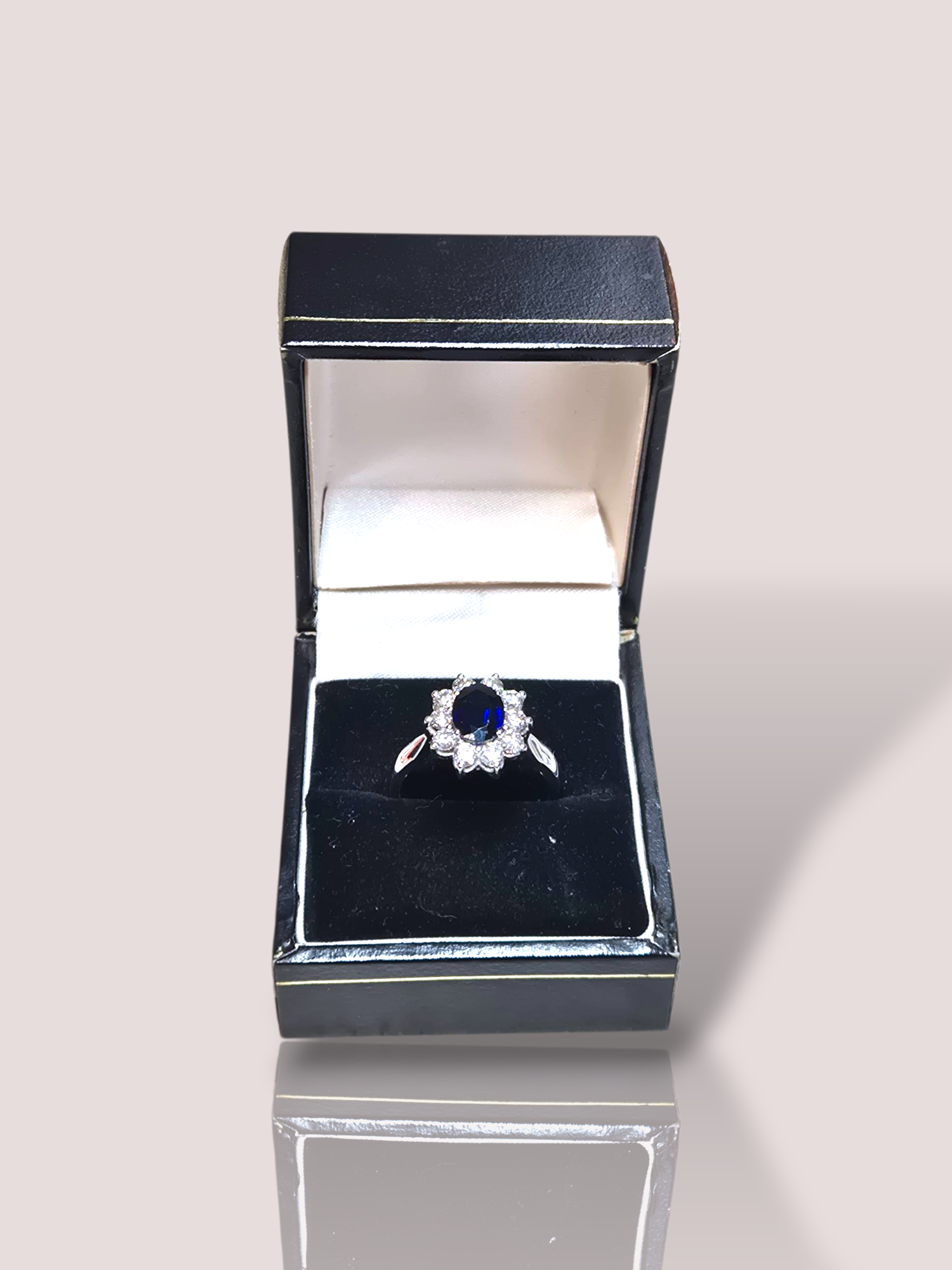 De diamanten wegen samen circa 0,922 ct en de saffier in het midden is 8 x 7 mm groot.