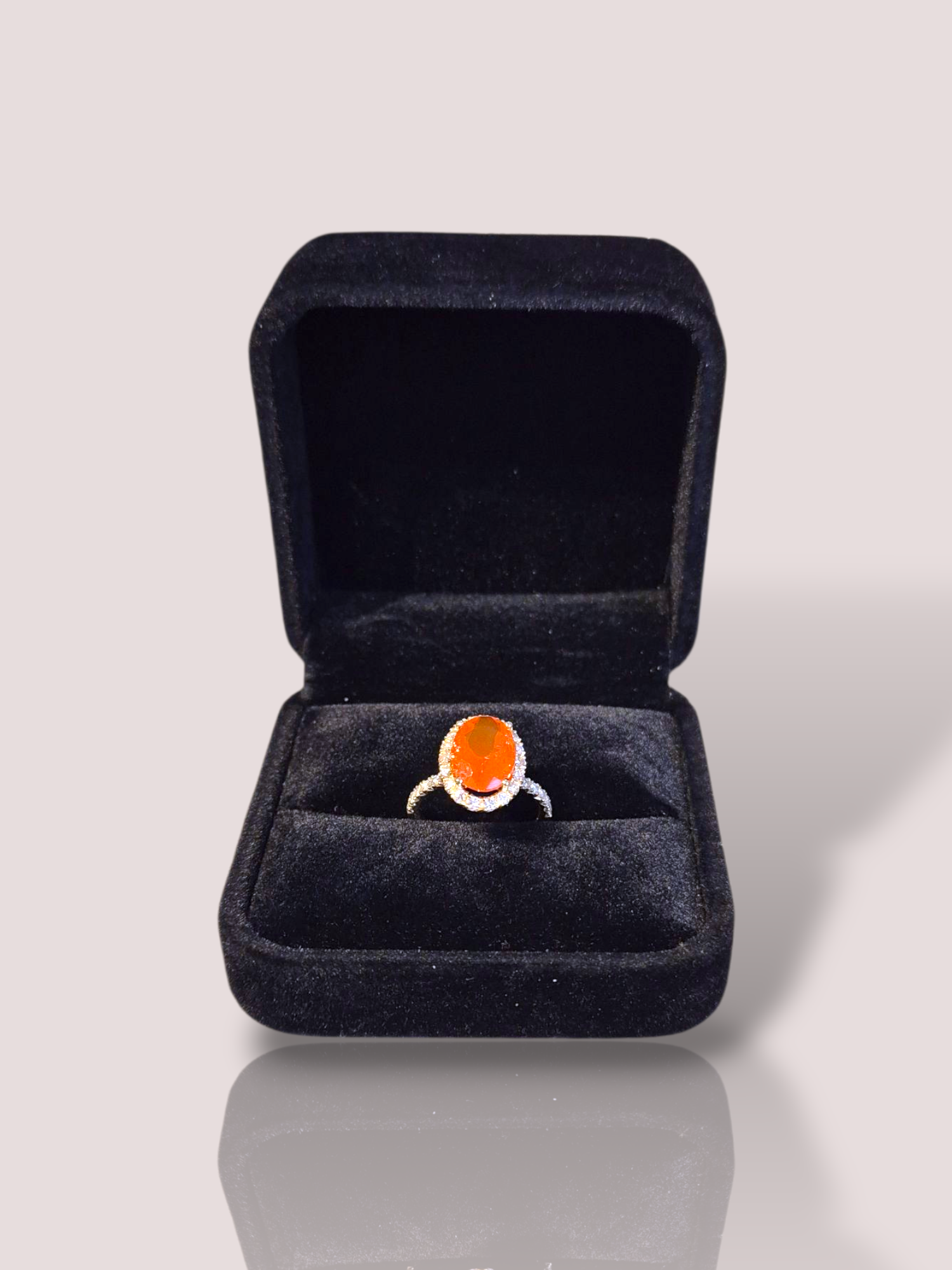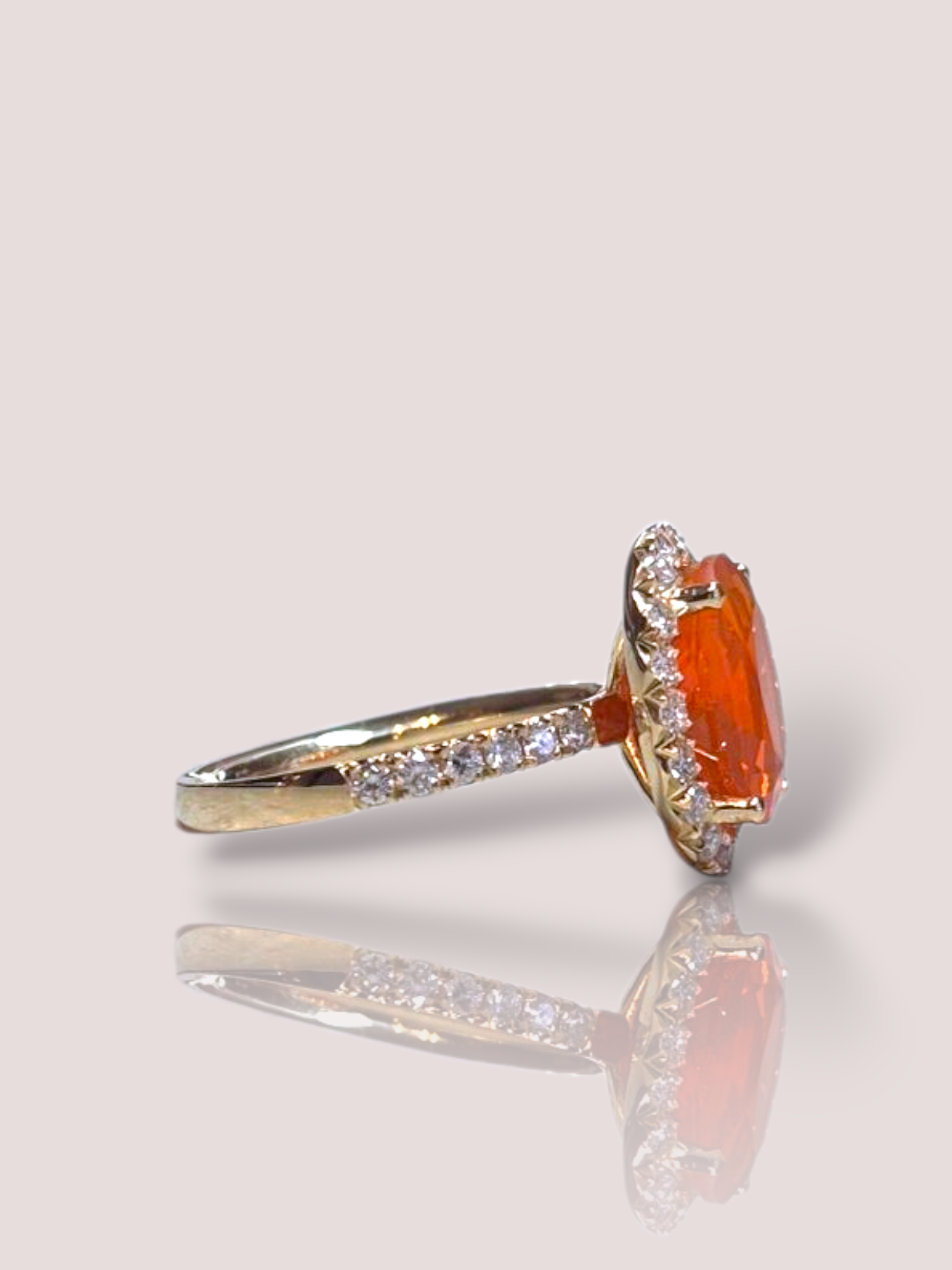 Prachtige House of Bruens 18k geel gouden ring met een beeldschone oranje vuuropaal van 12 bij 9 mm. De steen wordt omringd door 30 briljant geslepen zeer witte diamanten van de kwaliteit F/G VVS2. In totaal bevat de ring 0,75ct aan diamant.