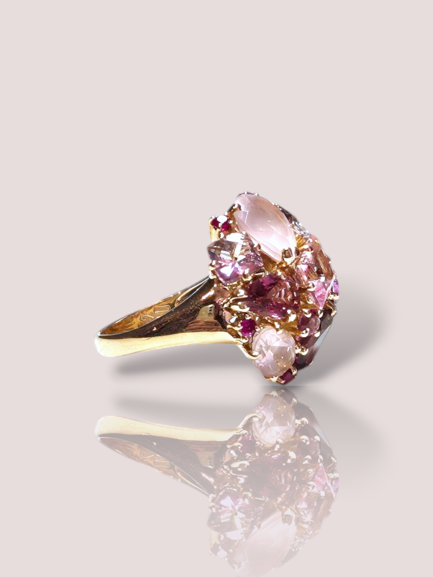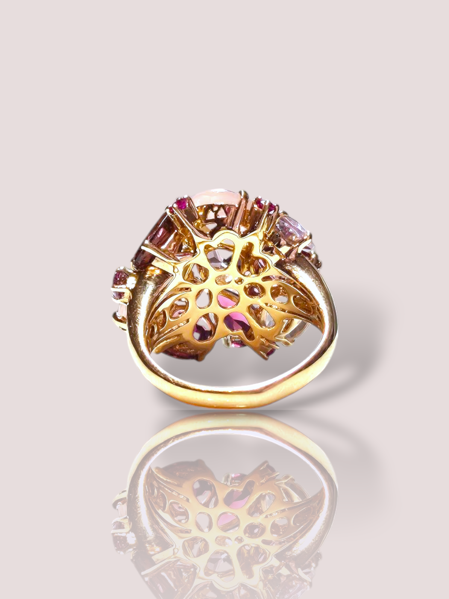 Deze prachtige bombé cocktailring van 18k rosegoud straalt luxe en elegantie uit. Deze ring heeft o.a. schitterende roze toermalijnen, robijntjes, diamant en rozen quartz. Als een opvallend accessoire past het perfect bij bijzondere gelegenheden. Draag deze schitterende ring als blikvanger op een gala of cocktailfeest. Combineer met andere gouden sieraden of minimalistische kleding om de ring echt tot zijn recht te laten komen.