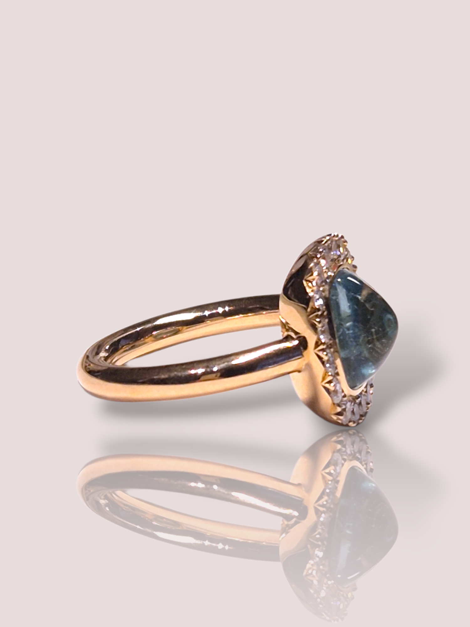 De aquamarijn is cabochon geslepen en heeft een gewicht van 4,43ct, omringt door 21 briljant geslepen diamanten van in totaal 1,785ct in F-G kleur en VS kwaliteit.