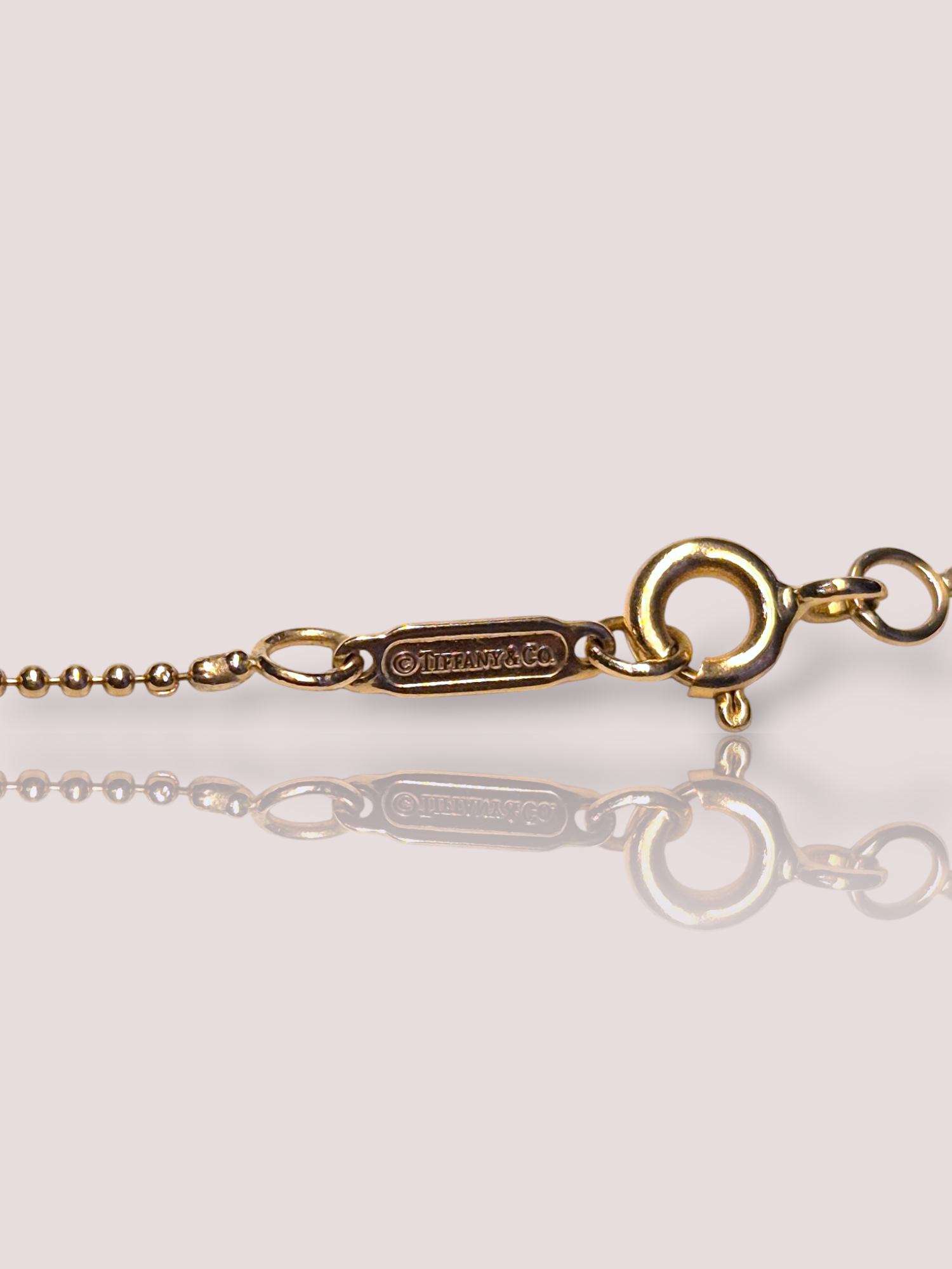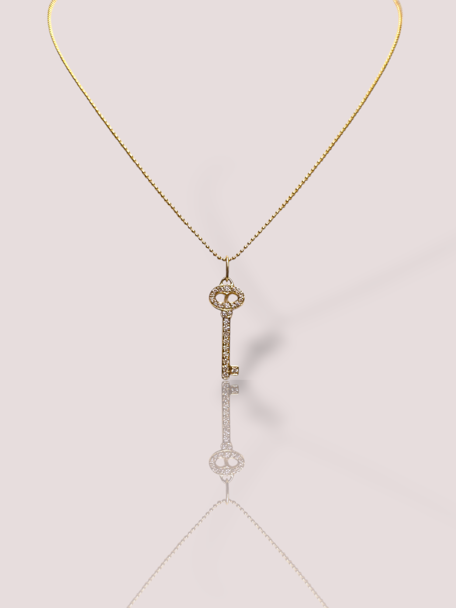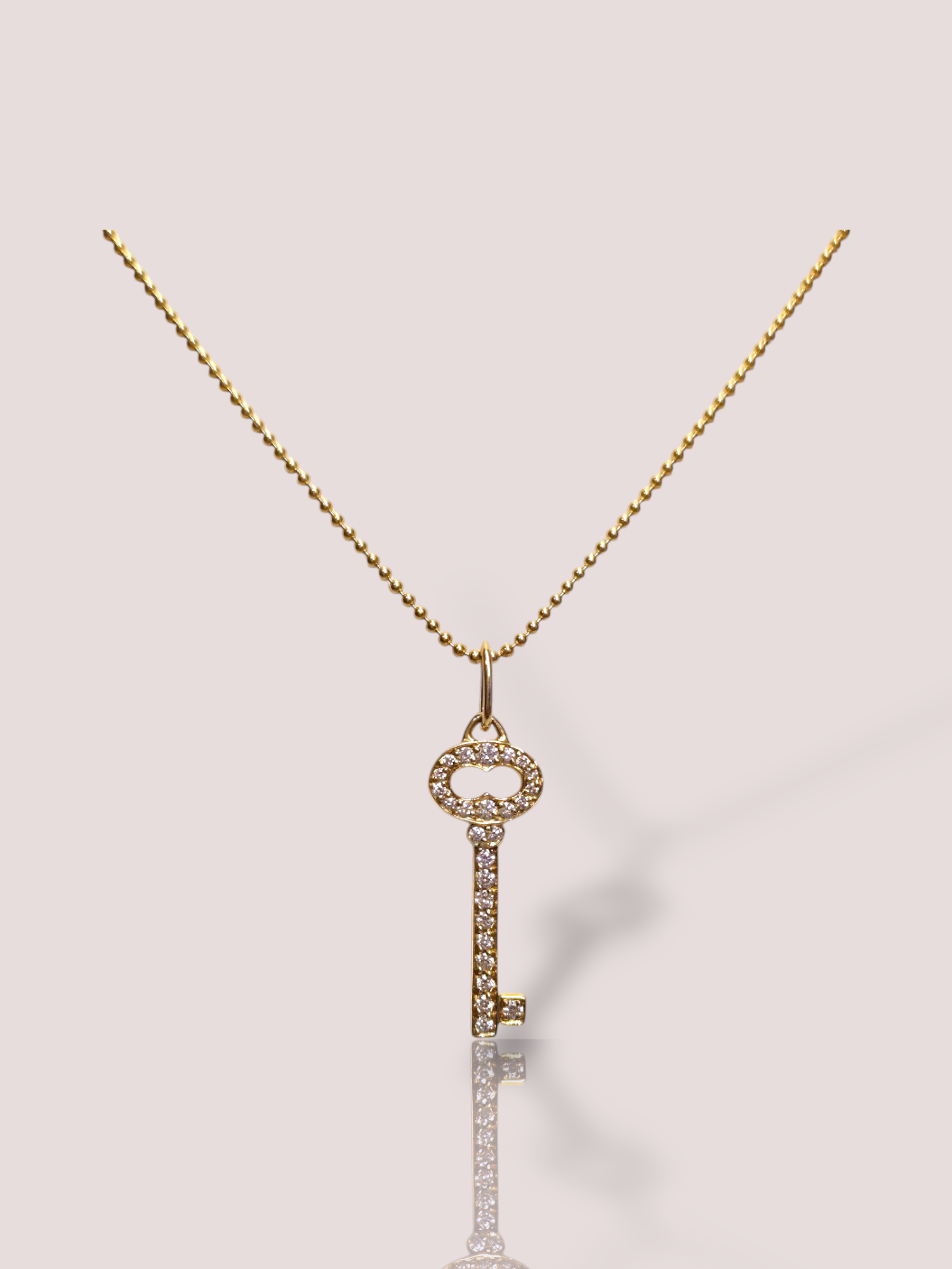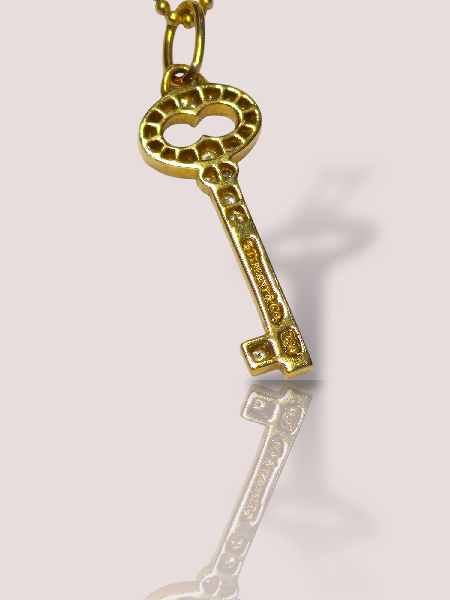 Deze prachtige Tiffany & Co 18 karaat vintage geel gouden sleutel ketting is ingelegd met schitterende diamanten als finishing touch. De ketting kan op verschillende manieren gedragen worden, zoals laag op de borst of juist als statement piece hoog op de hals. De vintage uitstraling geeft de ketting een tijdloos en elegant karakter. Een must-have voor elke juwelenliefhebber! De sleutel is 2,1 bij 8 mm.