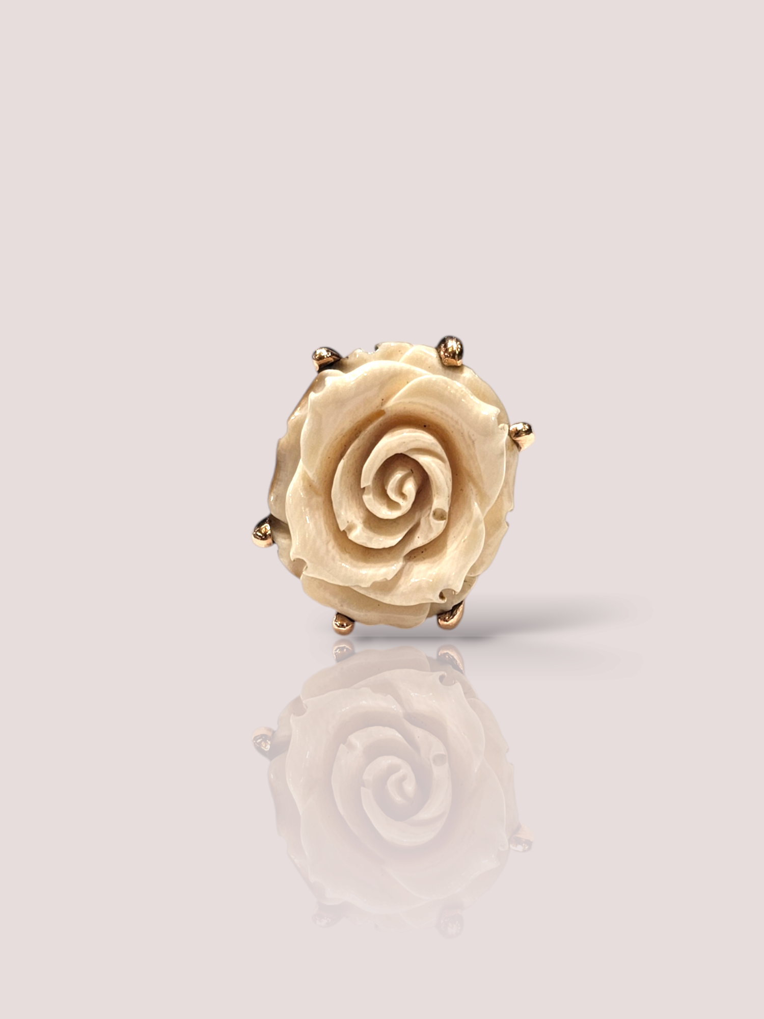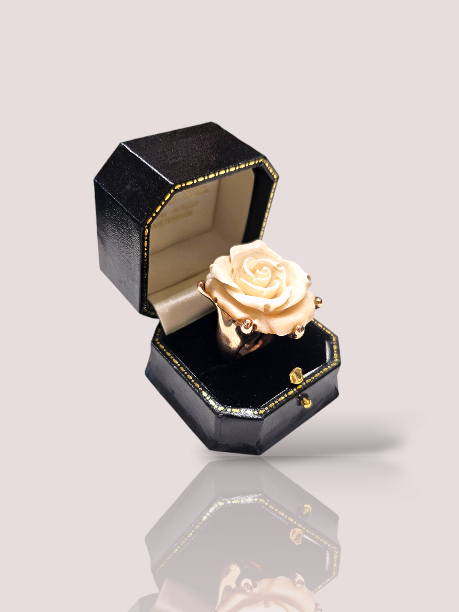 Deze prachtige vintage 12k rosé gouden ring is versierd met een prachtige roos sculptuur geslepen uit ivoor. De ring is een unieke en elegante toevoeging aan elke sieradencollectie en kan op zichzelf gedragen worden als statement stuk of in combinatie met andere ringen voor een gelaagde look. Stijlvol en tijdloos, deze ring is perfect voor elke gelegenheid. De roos is 3,7 bij 2,9 cm.