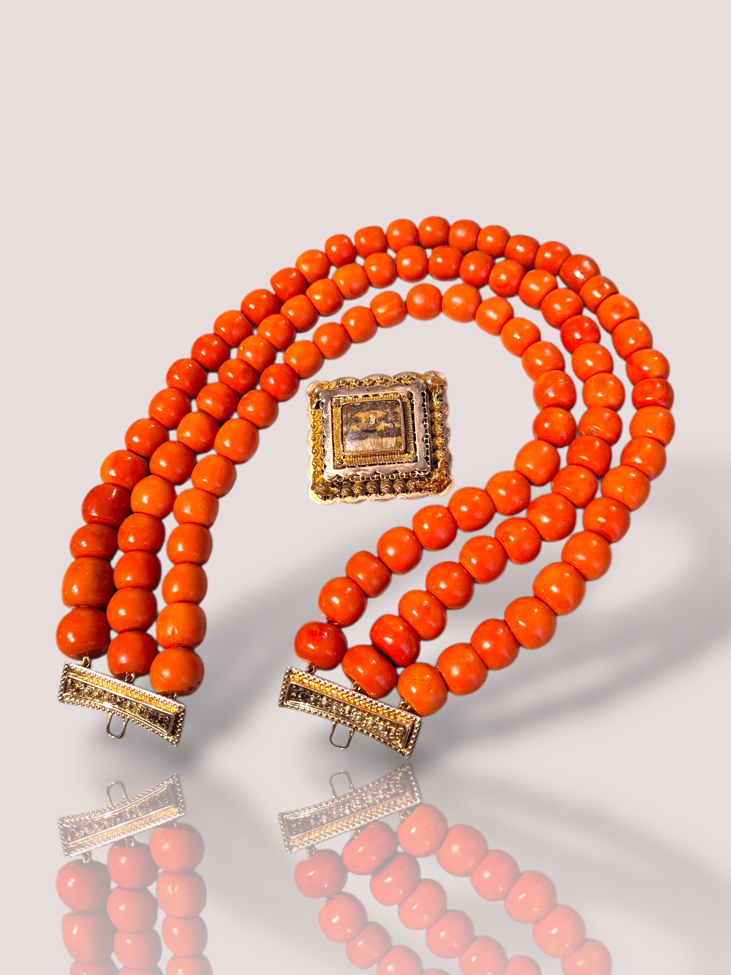 De staat van zowel de bloedkoralen als het goud is uitstekend! In totaal weegt het collier zonder slot 336 gram.