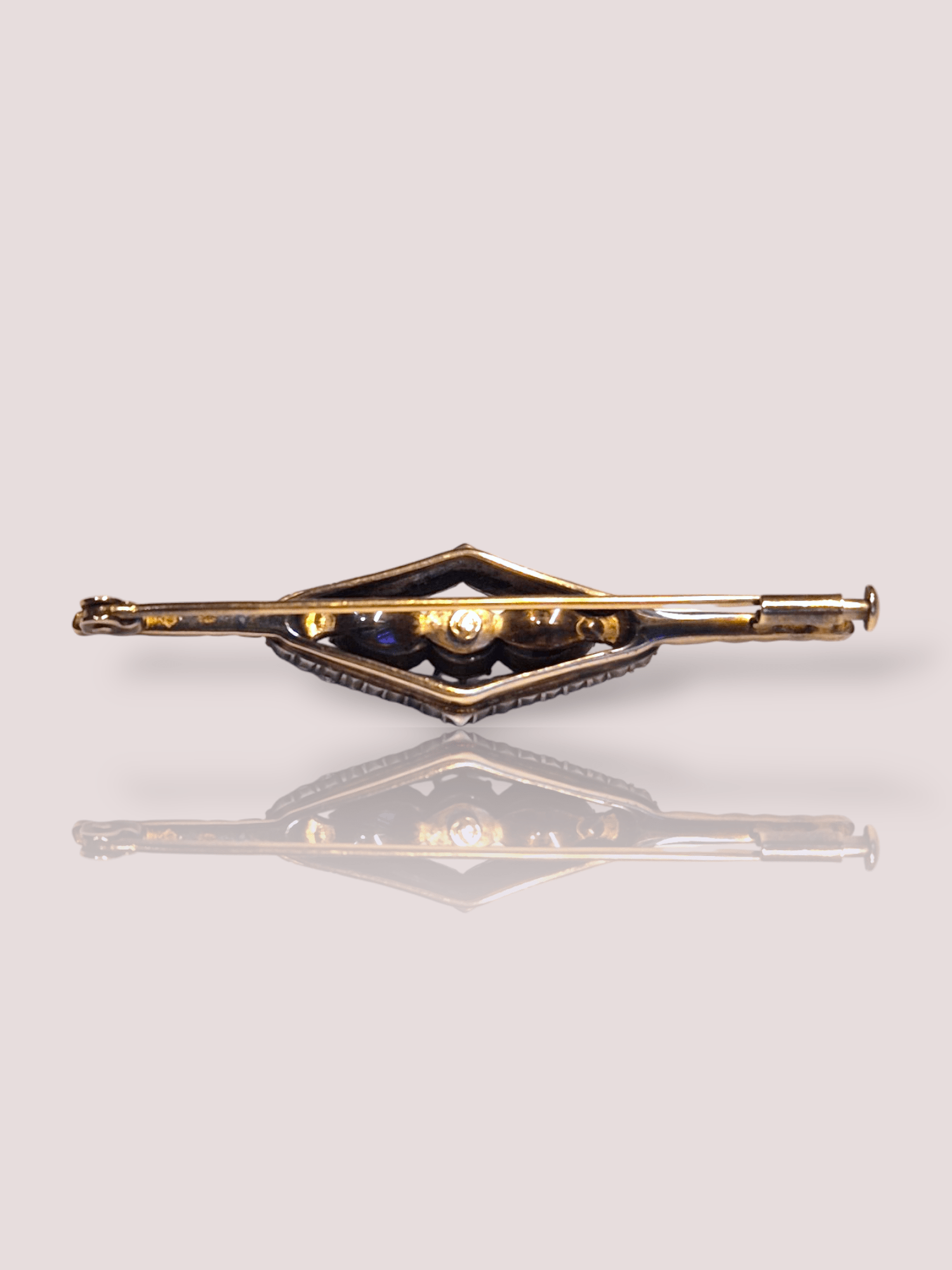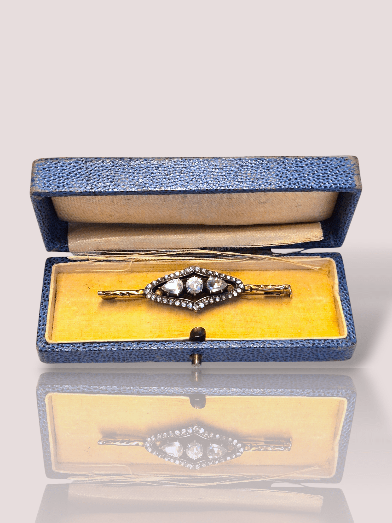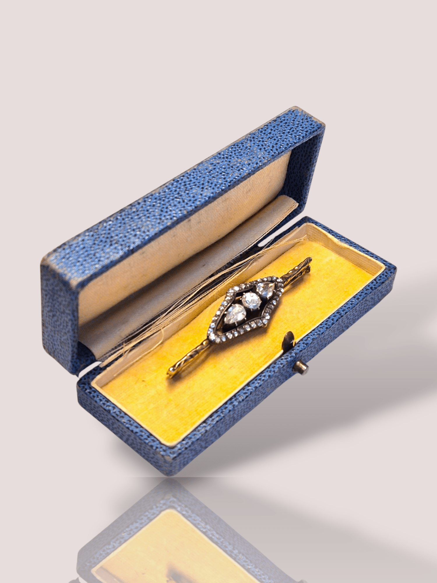 Deze vintage 14k geel gouden broche met roos geslepen diamanten, is een prachtig juweel. De broche is bezet met maar liefst 38 prachtige roosgeslepen diamanten. De center stone is 0,40ct met daarnaast 2 peer vormige diamanten van elk circa 0,33ct. In totaal bevat de broche 1,585ct aan diamant.