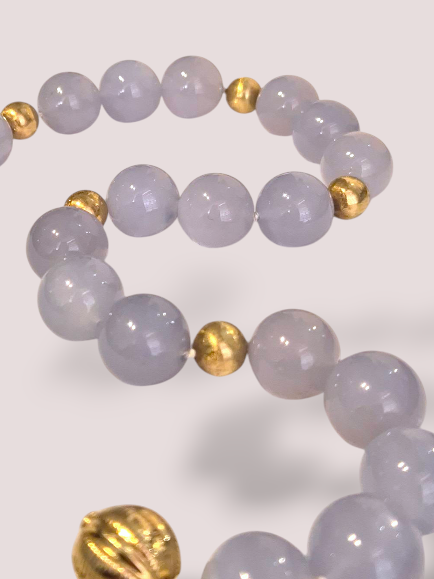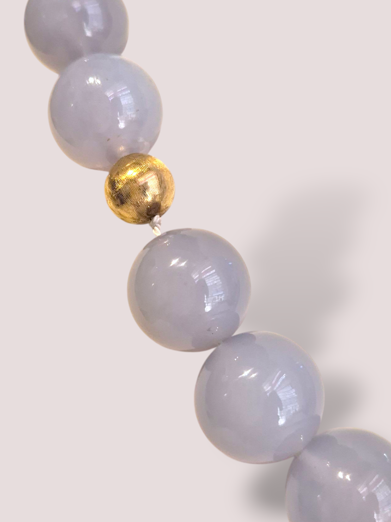 Dit vintage 14k geel gouden Chalcedoon kralen collier is een verfijnd en tijdloos sieraad. Deze tweekleurige ketting, gemaakt van geelgoud en chalcedoon, straalt elegantie uit. Het collier bevat 25 prachtige kralen van 1,7 diameter.
