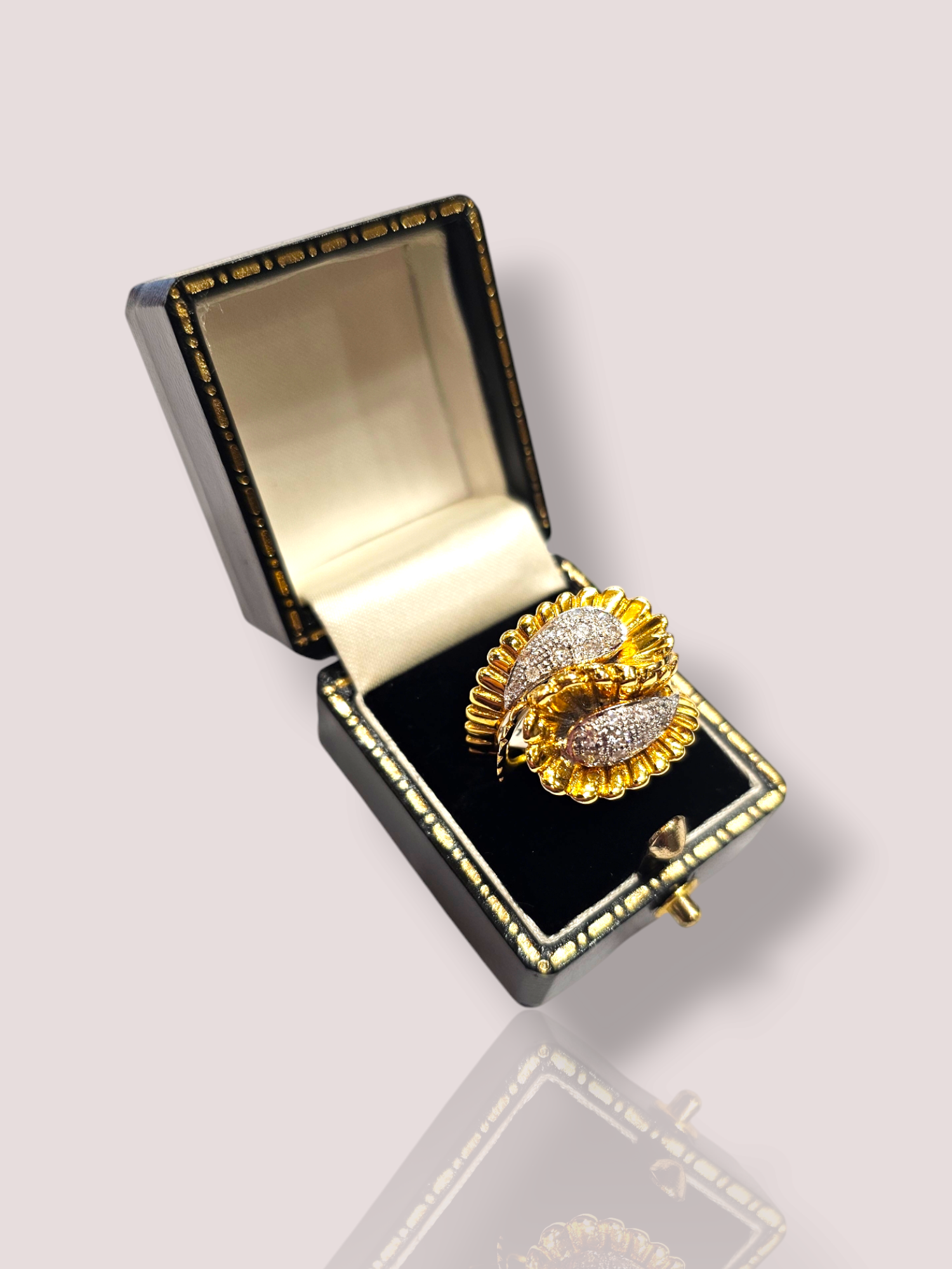 Deze vintage 14k geel gouden fantasie ring is versierd met een sprankelende diamant. De unieke ontwerp van de ring maakt het een perfect accessoire voor elke gelegenheid. Draag deze elegante ring solo voor een subtiele look of combineer het met andere gouden sieraden voor een meer opvallende uitstraling. Een tijdloos stuk dat zeker de aandacht zal trekken.