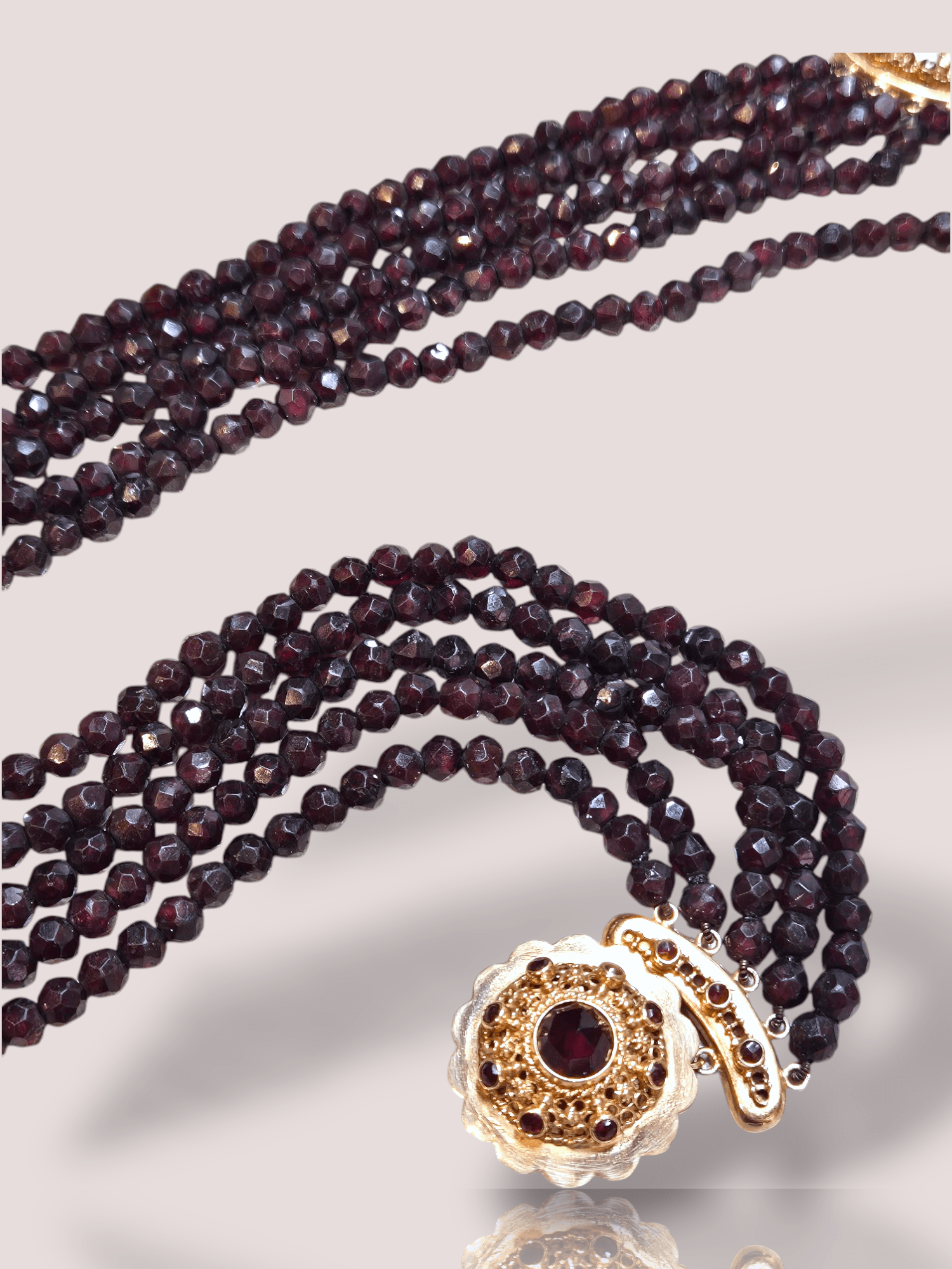 Dit collier bevat 5 rijen granaten, in totaal zitten er 382 granaten verwerkt in het collier.