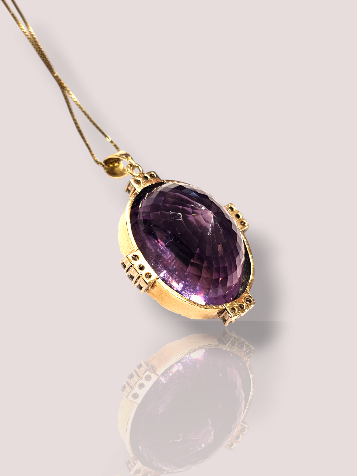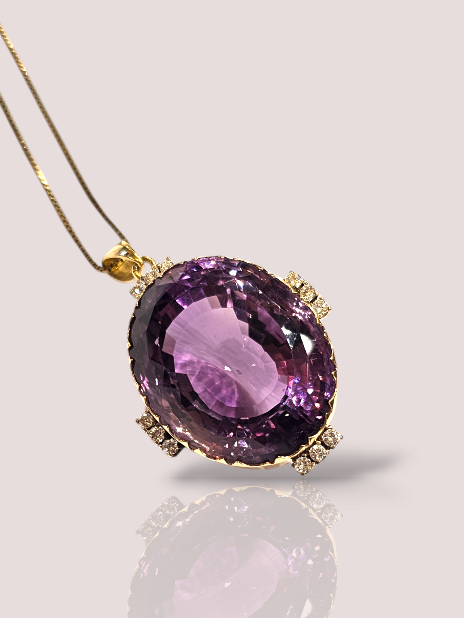 De amethist is 3,5 bij 3 cm en wordt vergezeld door 12 briljant geslepen diamanten.