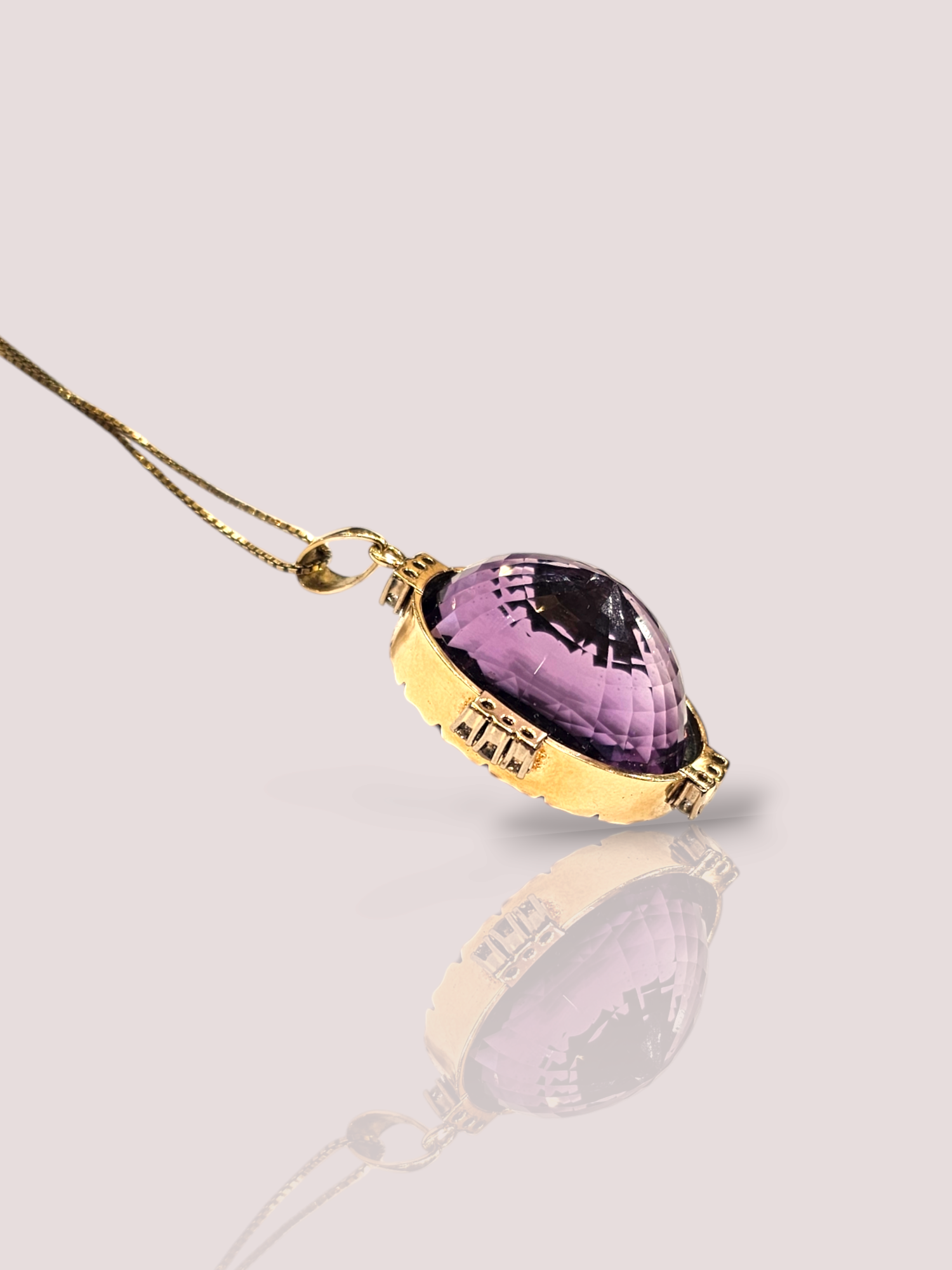 Deze prachtige vintage 14k geel gouden hanger is versierd met een waanzinnige glinsterende amethist en kleine diamanten voor een luxueuze uitstraling. De hanger kan gedragen worden aan een mooie ketting voor een elegante look, perfect voor speciale gelegenheden of gewoon voor dagelijks gebruik. Voeg een vleugje klasse toe aan je outfit met deze unieke hanger.