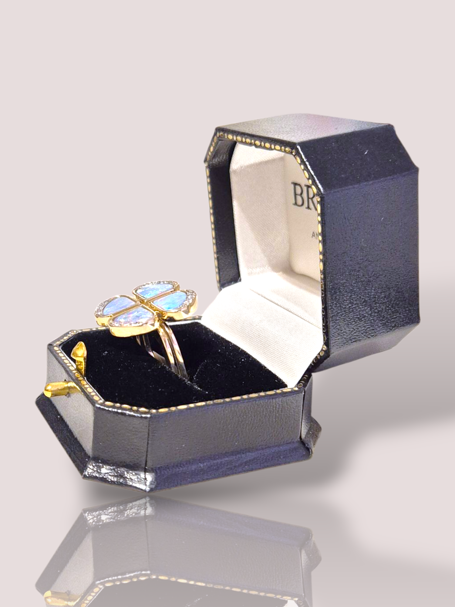 Deze vintage 14k geel gouden klaver-opaalring met diamant ( straalt elegantie uit met zijn glinsterende opaal en briljante diamant. Draag deze ring als opvallend accessoire bij zowel casual als formele outfits. De gouden klaver brengt een vleugje geluk en stijl, perfect voor elke gelegenheid. Voeg tijdloosheid en charme toe aan je uitstraling.