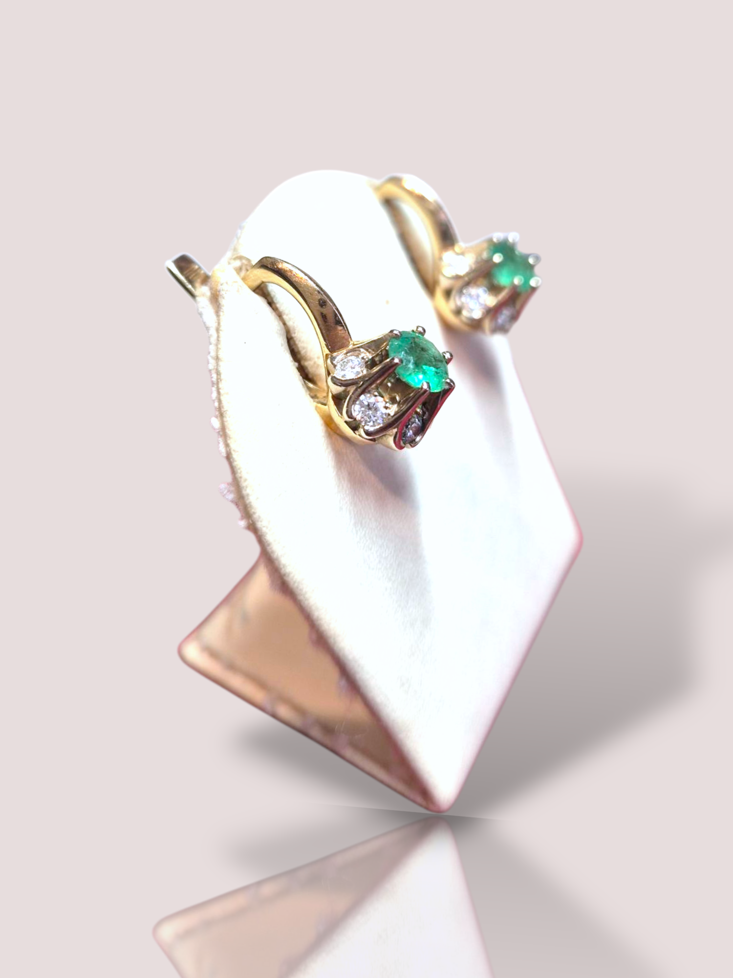 Deze vintage 14k geel gouden oorstekers zijn voorzien van smaragd en diamanten. Deze elegante hanger oorbellen zijn perfect om een stijlvolle en verfijnde look te creëren. Combineer ze met je favoriete avondjurk of bij een chique gelegenheid om je outfit een luxe uitstraling te geven. Een tijdloze toevoeging aan elke sieradencollectie.