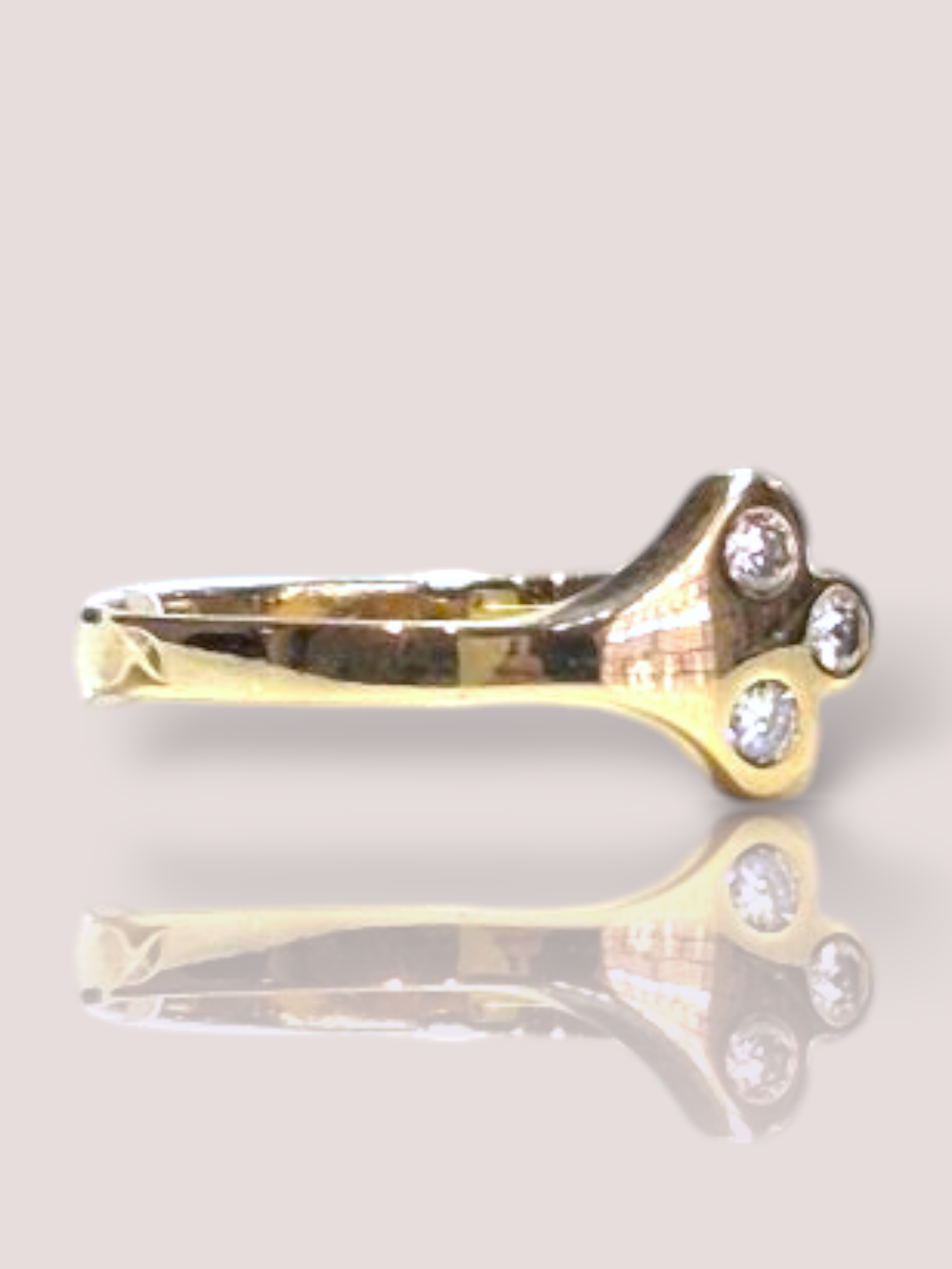Deze prachtige vintage 14k geelgouden ring is voorzien van drie schitterende diamanten. De ring is tijdloos en elegant, perfect voor elke gelegenheid. Draag hem alleen voor een subtiele touch of combineer hem met andere ringen voor een meer gedurfde look. Deze ring zal zeker een eyecatcher zijn en een aanvulling zijn op elke sieradencollectie.