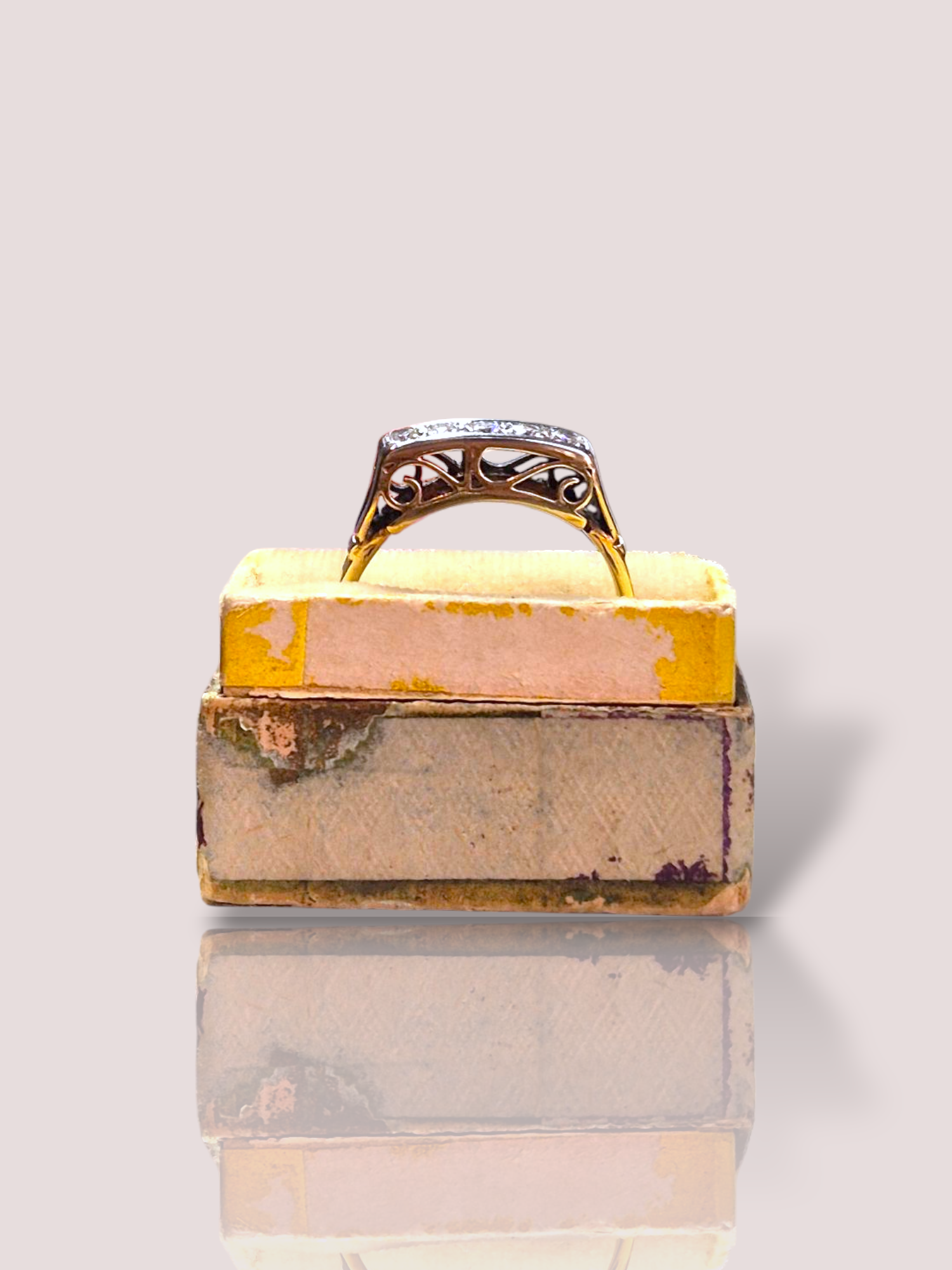 Deze vintage 14k geel gouden ring met 5 briljant geslepen diamanten heeft een tijdloos ontwerp en elegante uitstraling. De ring is bezet met prachtige diamanten die zorgen voor een subtiele glans. Draag deze ring solo voor een chique look of combineer met andere gouden sieraden voor een opvallende uitstraling. Perfect voor speciale gelegenheden of dagelijks gebruik. Voeg deze eyecatcher toe aan jouw sieradencollectie!