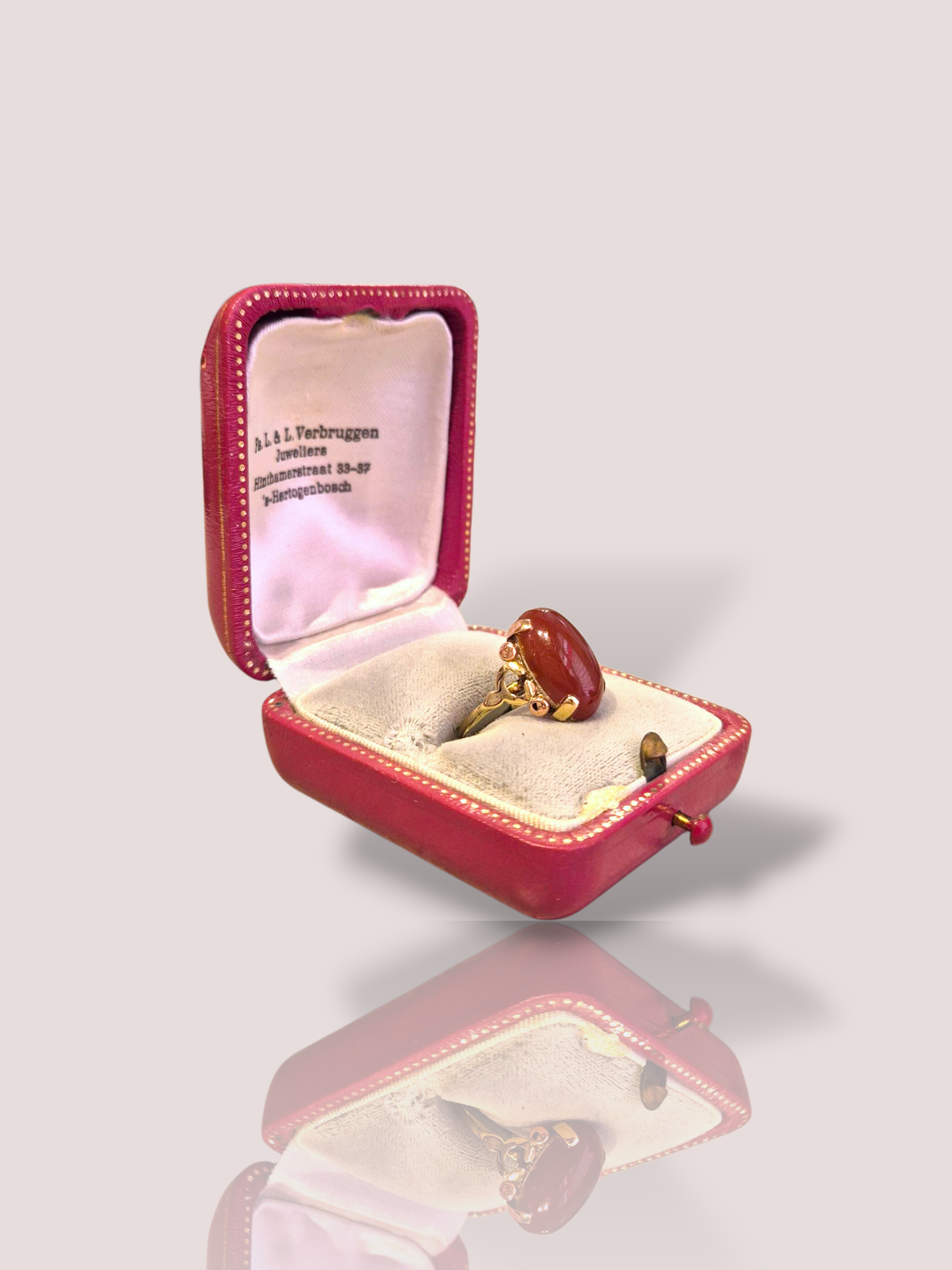Deze prachtige vintage ring is gemaakt van 14k geel goud en heeft een schitterende carneool steen. De ring heeft een klassiek ontwerp en is perfect om dagelijks te dragen of voor speciale gelegenheden. Combineer deze ring met andere gouden sieraden voor een elegante look. Voeg deze tijdloze ring toe aan je collectie voor een vleugje vintage glamour.