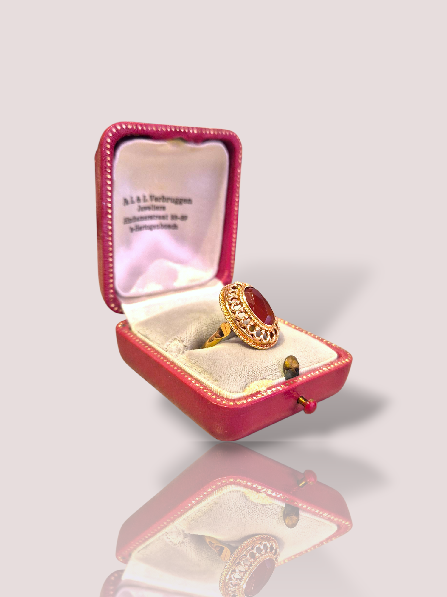 Deze prachtige vintage 14k geel gouden ring heeft een schitterende carneool edelsteen. De ring is tijdloos en elegant, perfect voor elke gelegenheid. Draag deze ring alleen of combineer hem met andere gouden sieraden voor een luxe uitstraling. Met zijn unieke kleur en subtiele glans zal deze ring zeker de aandacht trekken. Voeg deze unieke ring toe aan je collectie en straal altijd in stijl!