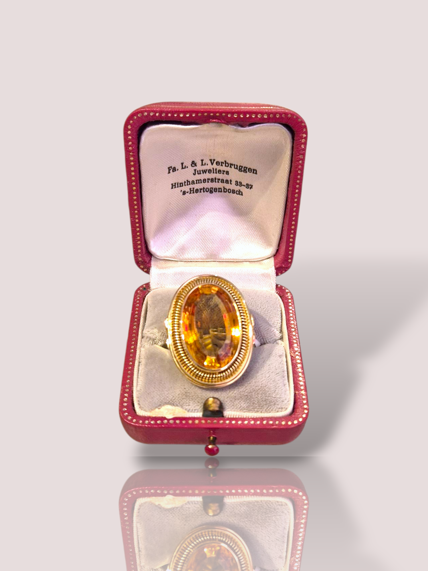 Deze vintage 14k gouden ring met citrien heeft een prachtige uitstraling dankzij de heldere citrien steen. Het geelgouden design geeft de ring een klassieke en elegante look. Draag deze ring solo voor een subtiele touch of combineer hem met andere gouden sieraden voor een luxe uitstraling. De perfecte aanvulling voor elke sieradencollectie.
