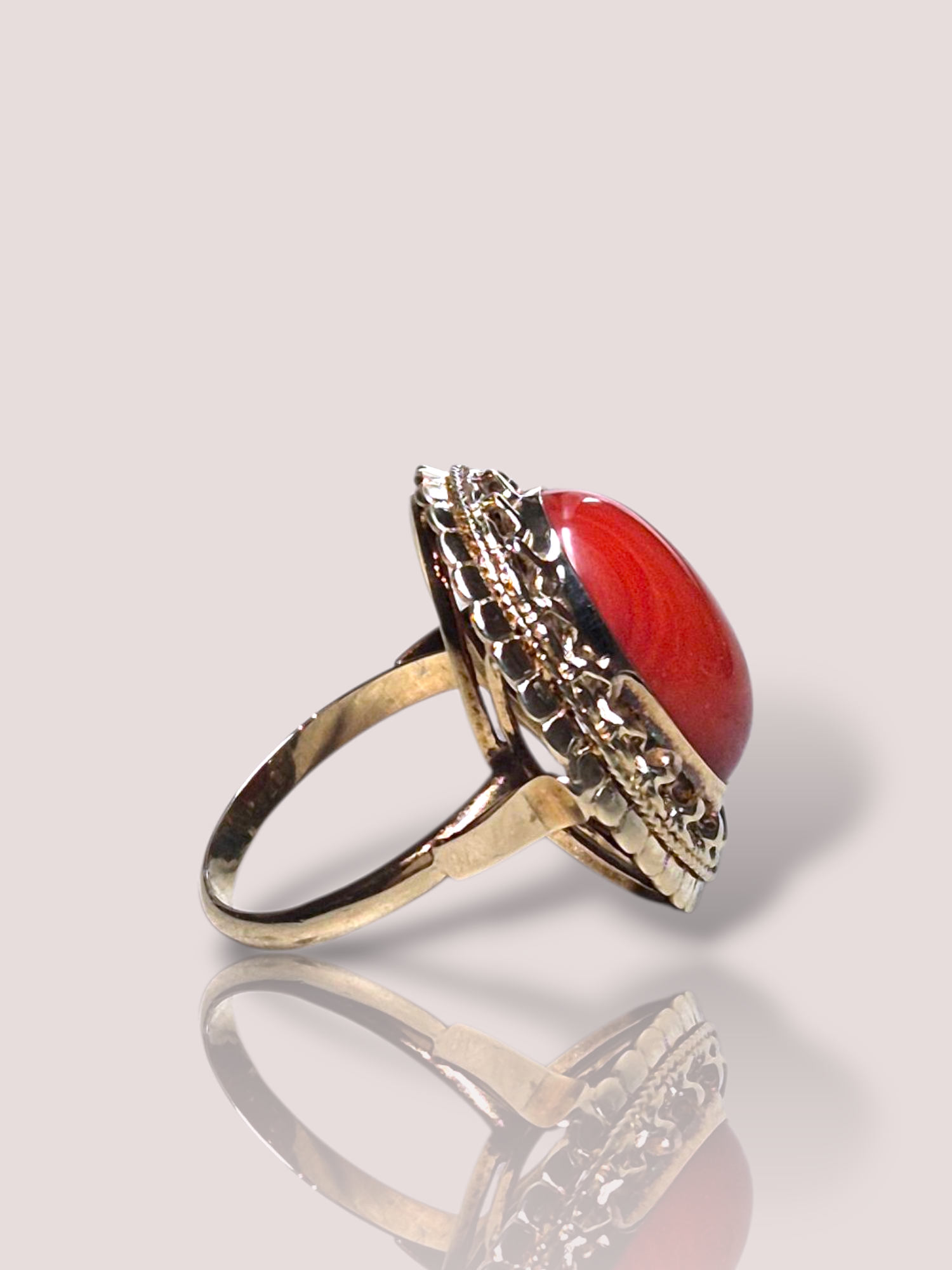 Deze Vintage 14k geel gouden ring met koraal, is een uniek sieraad met een opvallende koraalsteen. Ideaal voor een elegante uitstraling bij zowel formele als casual gelegenheden. Draag het als een statementstuk op je rechterhand voor extra flair. Een tijdloze toevoeging aan elke sieradencollectie. Perfect voor elke gelegenheid!