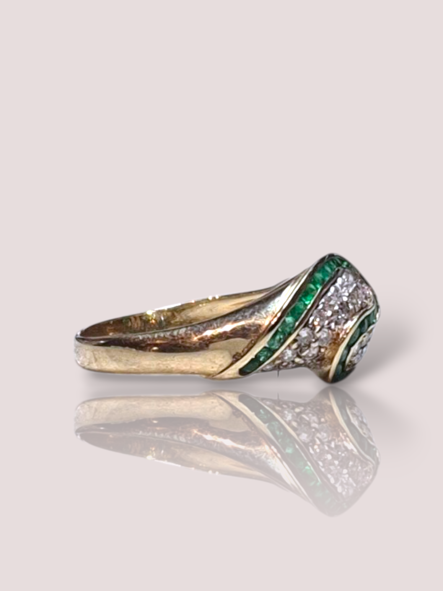 Deze Vintage 14k geel gouden ring met smaragd en diamant  is een schitterend sieraad dat elegantie en verfijning uitstraalt. De combinatie van smaragd en diamant zorgt voor een tijdloze uitstraling. Draag deze ring als middelpunt op een speciale gelegenheid of als dagelijks statement sieraad om je look te verfraaien. Perfect voor elke juwelencollectie.
