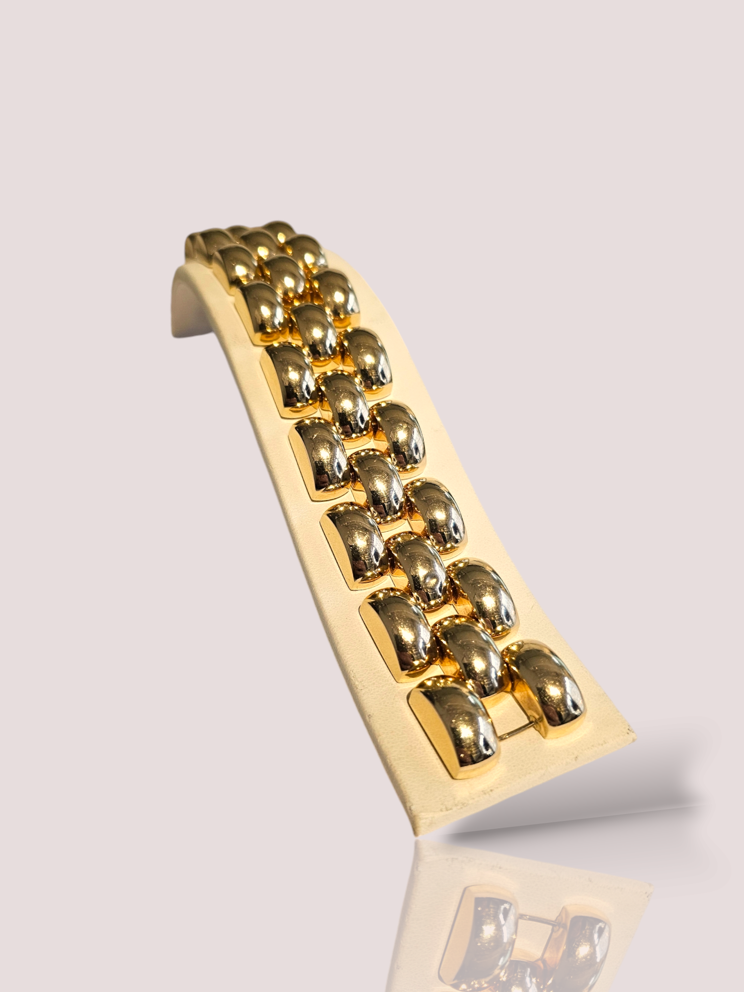 Deze vintage 14k geel gouden schakel armband onderscheidt zich door zijn klassieke uitstraling en hoogwaardige kwaliteit. Met een stevige sluiting en elegante schakels is deze armband perfect voor dagelijks gebruik of speciale gelegenheden. Draag het alleen voor een subtiele touch of stapel het met andere armbanden voor een trendy look. Een tijdloos sieraad dat elke outfit compleet maakt. De armband is 19 cm lang en 2,5 cm breed. De armband weegt ruim 64 gram.