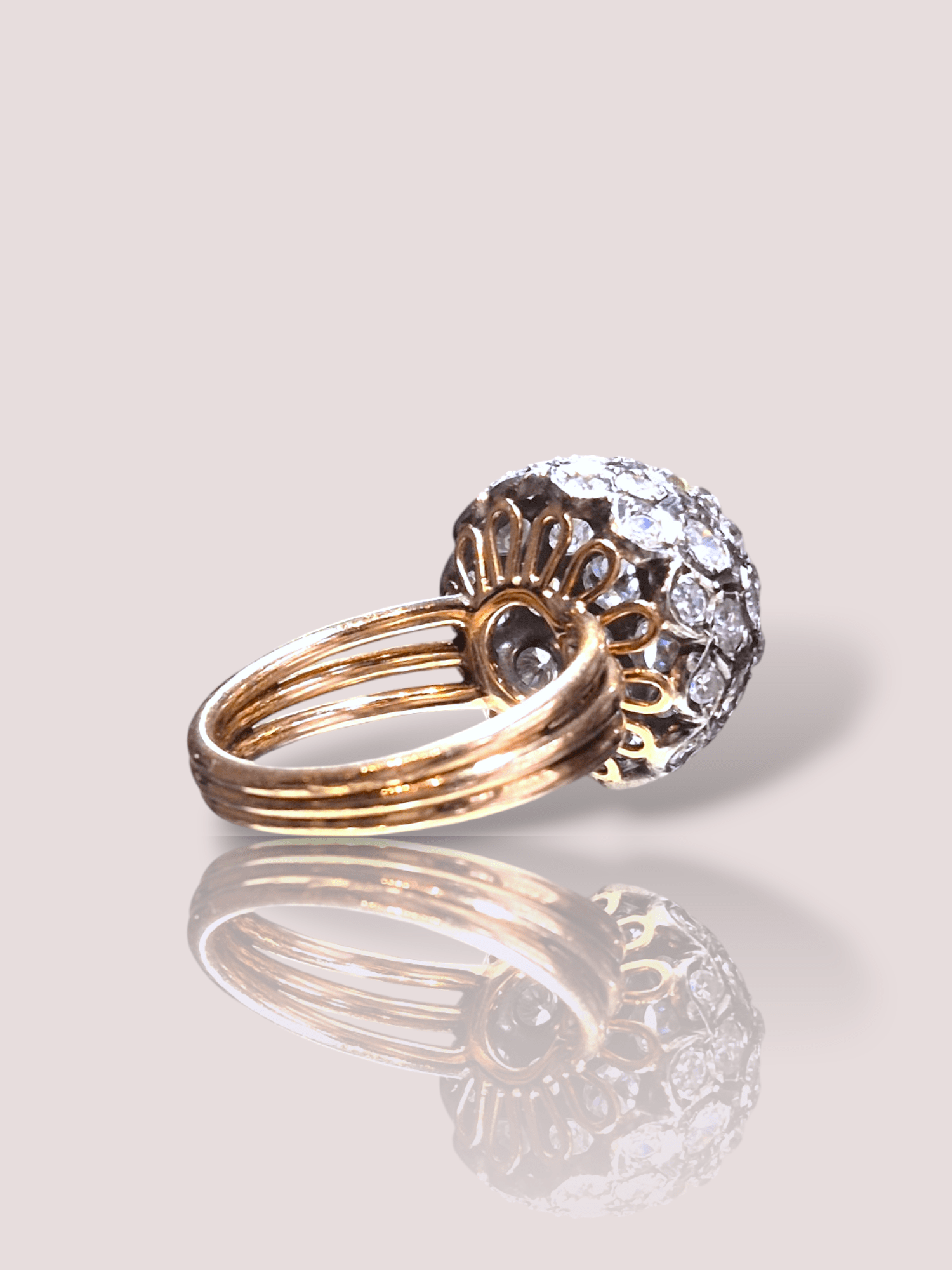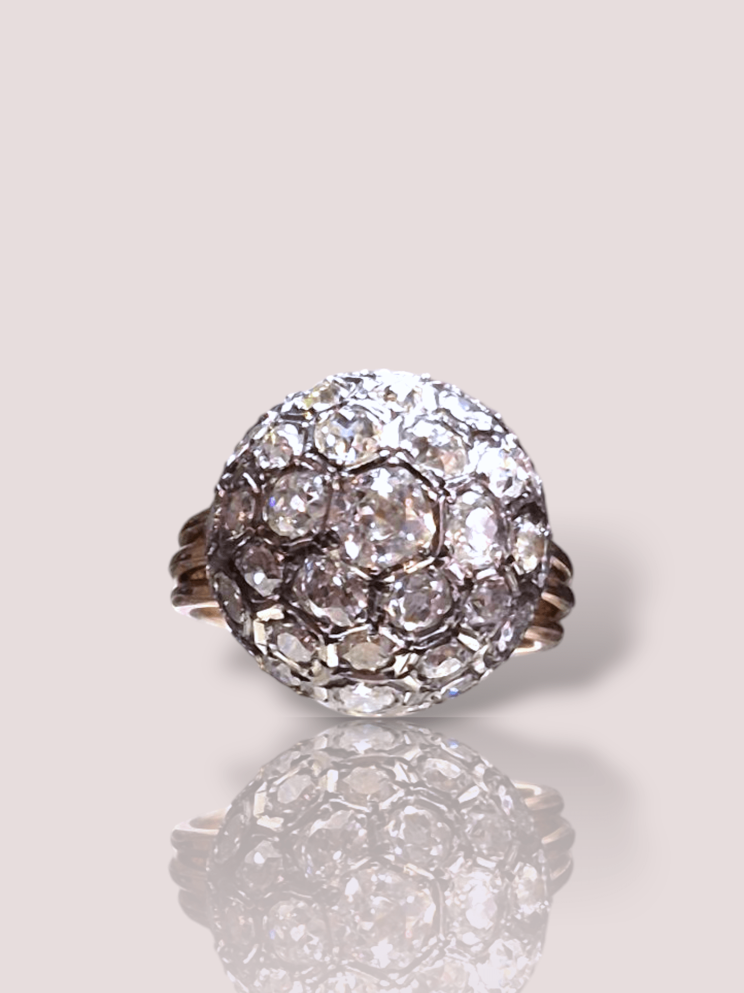 Deze vintage 14k rosé gouden bolring met Bolsjewiek geslepen diamanten  is een schitterend sieraad dat elegantie en verfijning uitstraalt. De prachtige oud-geslepen diamanten geven de ring een geweldige uitstraling! In totaal bevat de ring circa 3 ct aan diamanten, de center stone heeft een gewicht van circa 0,6ct.