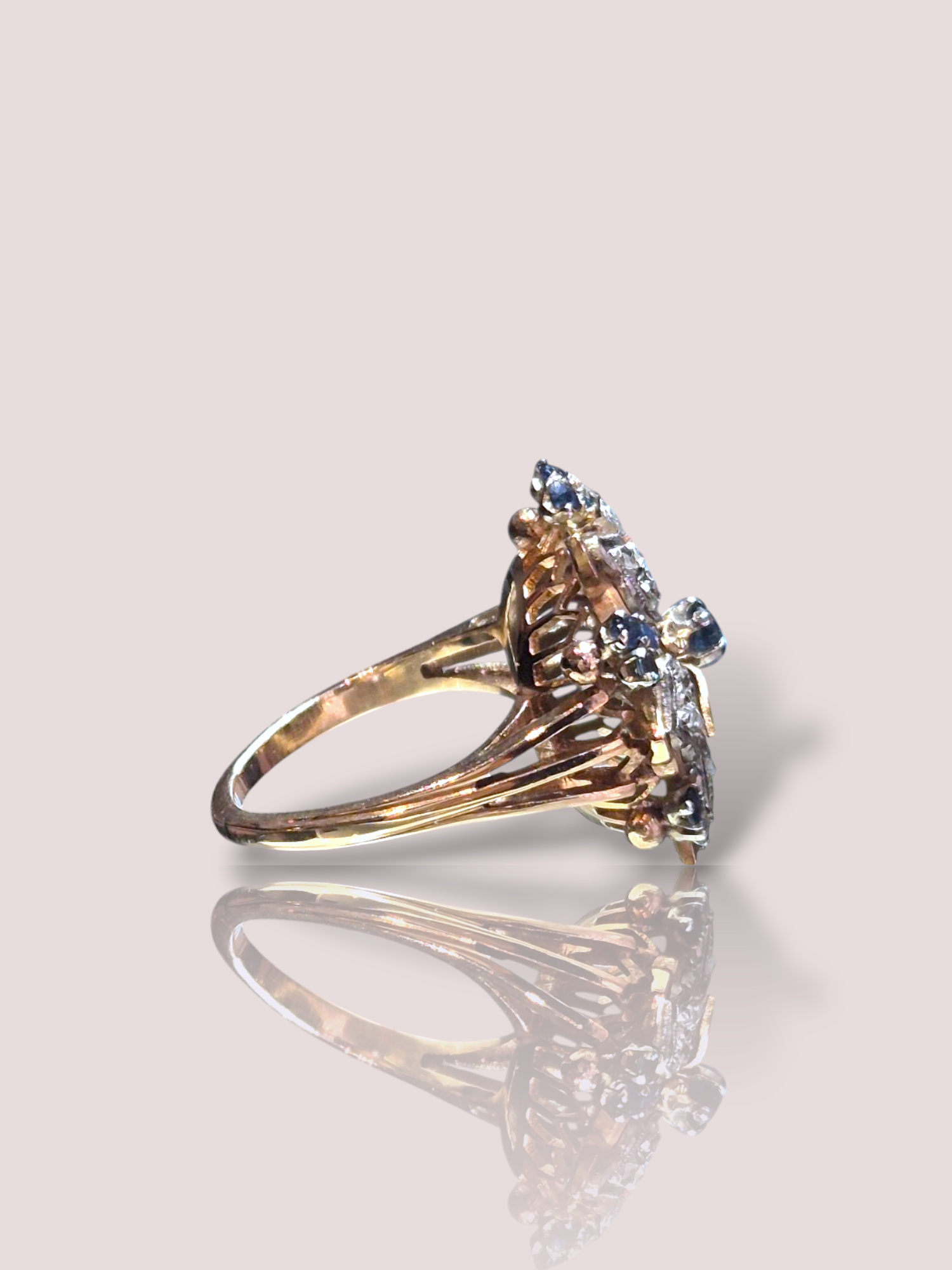 Deze prachtige vintage 14k rosegouden ring bevat schitterende saffieren en roos geslepen diamanten. De ring vormt een bloem met in het hart een bewegende saffier. De ring is op dit moment maat 21 en kan hierdoor perfect om de wijsvinger gedragen worden, de ring kan echter kan eenvoudig kleiner gemaakt worden.