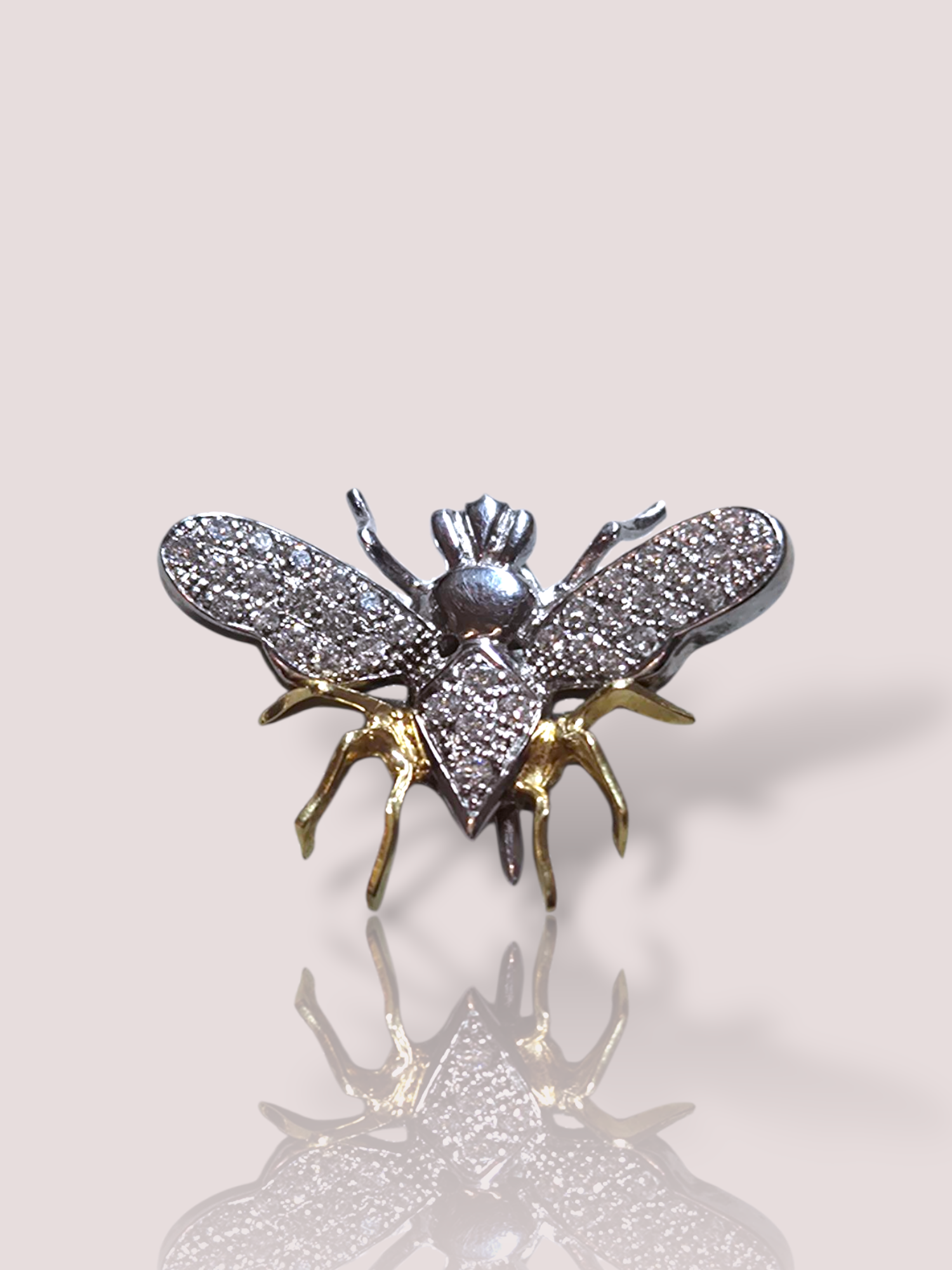 De vlieg is 3 bij 2 cm en kan eenvoudig middels de witgouden pin bevestigd worden. De broche bevat circa 0,70ct aan diamanten.