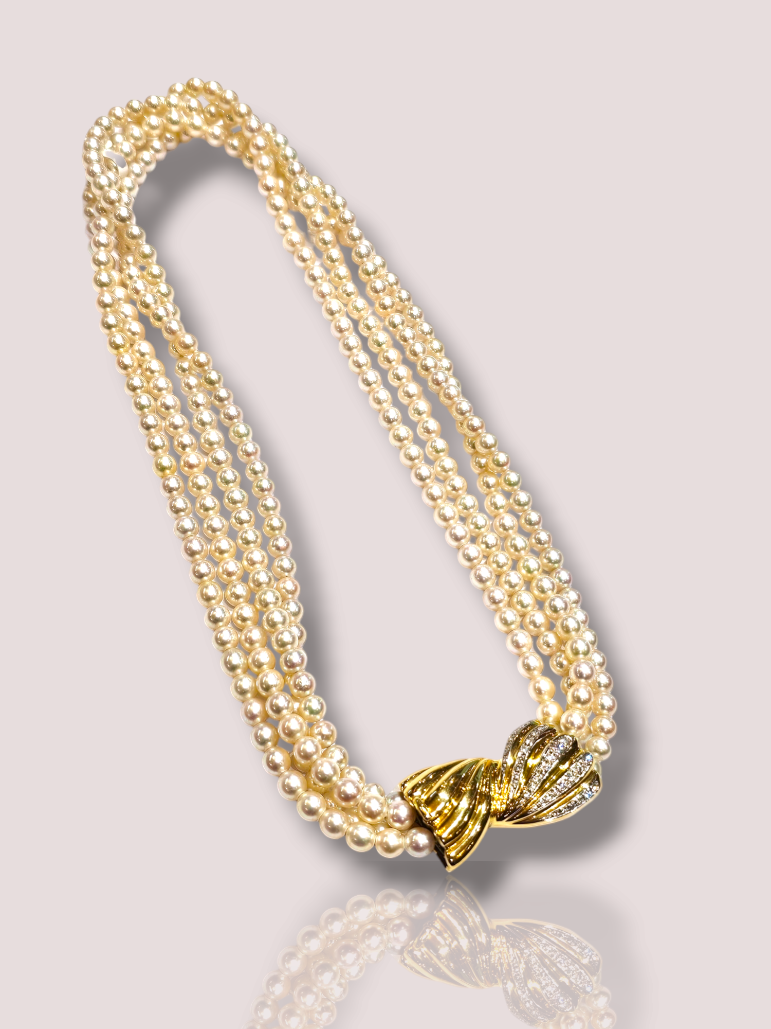 Het collier is 43 cm lang en heeft 4 rijen parels. Het gouden slot is prachtig ingelegd met 35 briljant geslepen diamanten.