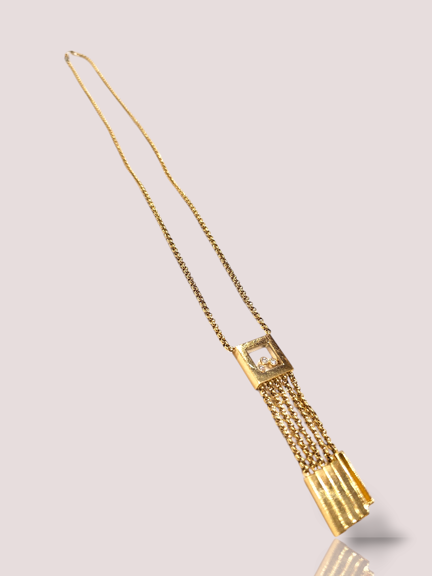 Dit Vintage 18k geel gouden Chopard Happy Diamonds collier is voorzien van bewegende diamanten die schitteren en sprankelen bij elke beweging. Het collier is perfect om zowel overdag als 's avonds te dragen en voegt een vleugje glamour toe aan elke outfit. Draag het om je hals voor een elegante en stijlvolle uitstraling die de aandacht trekt. De drie diamanten bewegen en de hanger heeft bewegende gouden staafjes aan kettinkjes. De ketting is 42 cm lang. De kettinkjes aan de hanger zijn 4 cm lang.